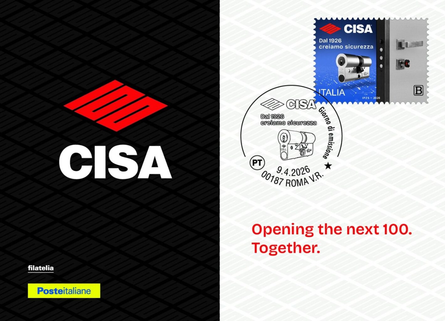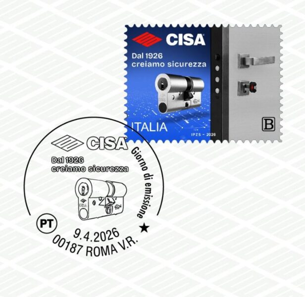 Il francobollo dedicato a CISA raffigura una porta moderna dotata di serratura blindata completa – catenacci, scrocco, maniglia e chiave inserita nel cilindro – con un dettaglio sul cilindro di sicurezza RS5. L’immagine è accompagnata dal logo del centenario e dal pay-off “DAL 1926 CREIAMO SICUREZZA”.