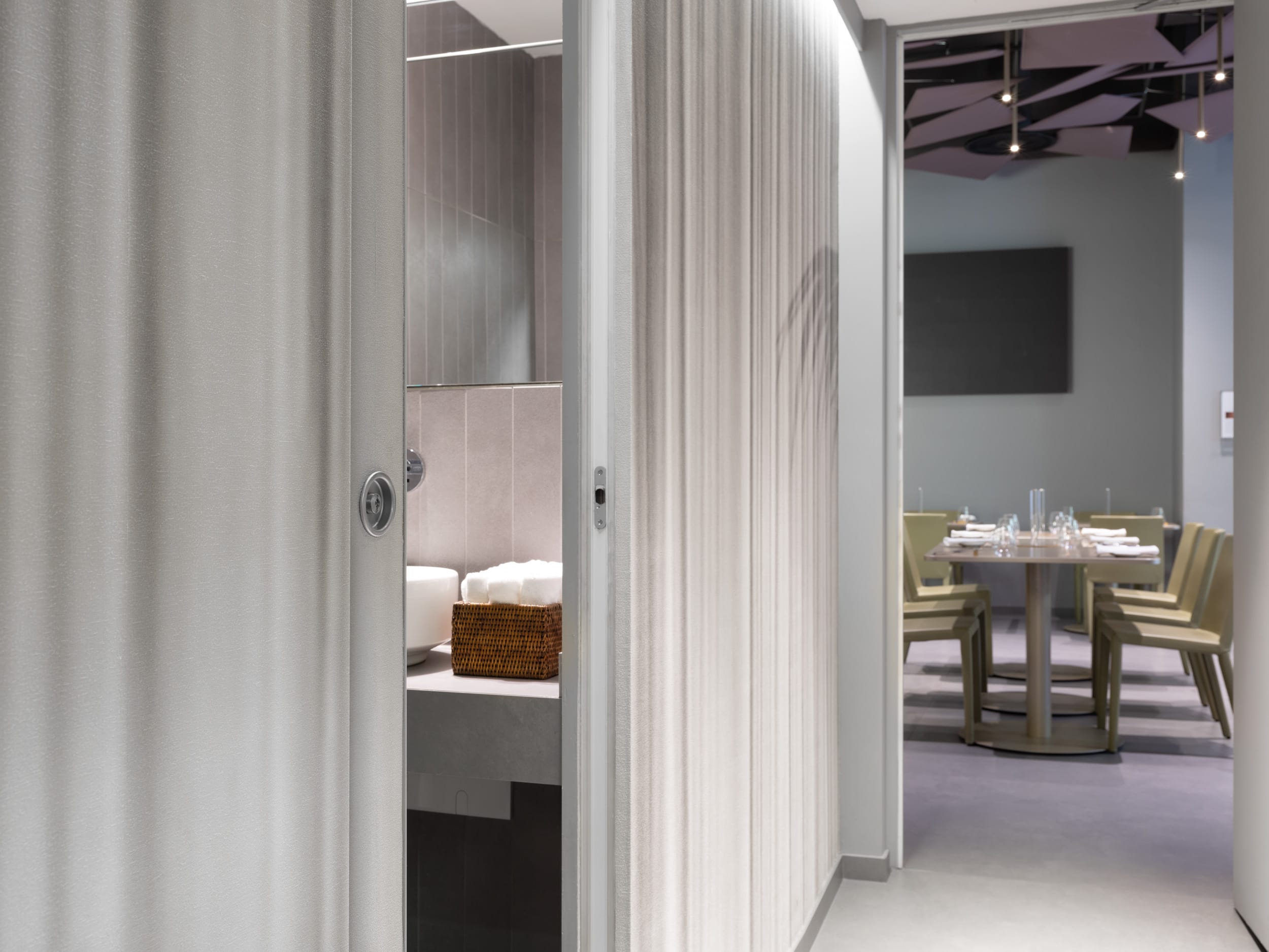 Nel punto che collega la reception di prima accoglienza con la stanza ovale è stata posizionata una porta a scomparsa con apertura automatica, soluzione resa possibile grazie all’installazione di un controtelaio ECLISSE Unico, accessoriato con la motorizzazione lineare E-motion. Passaggi rapidi e fluidi, senza interruzioni e assolutamente silenziosi, per muoversi senza il minimo rumore. Il comfort acustico è un aspetto tecnico fondamentale estremamente importante nel settore della ristorazione, oltre ad essere uno dei principali parametri di valutazione nei giudizi sulla qualità complessiva in un contesto di esperienza multisensoriale.