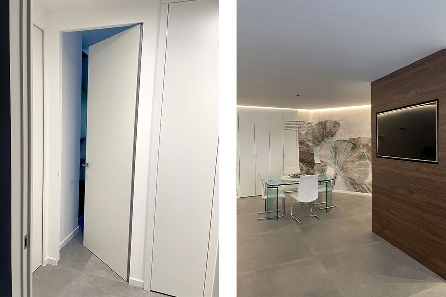 Le porte per interni installate nel progetto Casa M sono le porte filo muro Absolute Swing e le per porte scorrevoli filo muro Absolute Evo di Ermetika, le quali hanno permesso di realizzare un design d’interni minimalista e di ottimizzare al meglio gli spazi grazie alla loro funzionalità e alle loro componenti estetiche, che hanno garantito eleganza e raffinatezza.