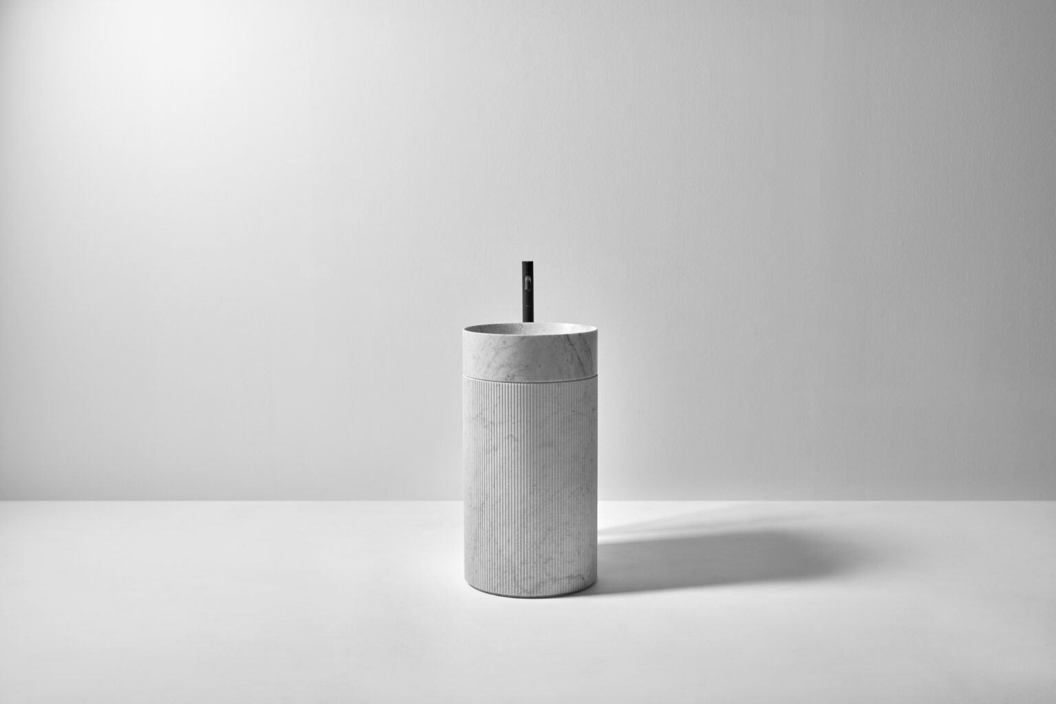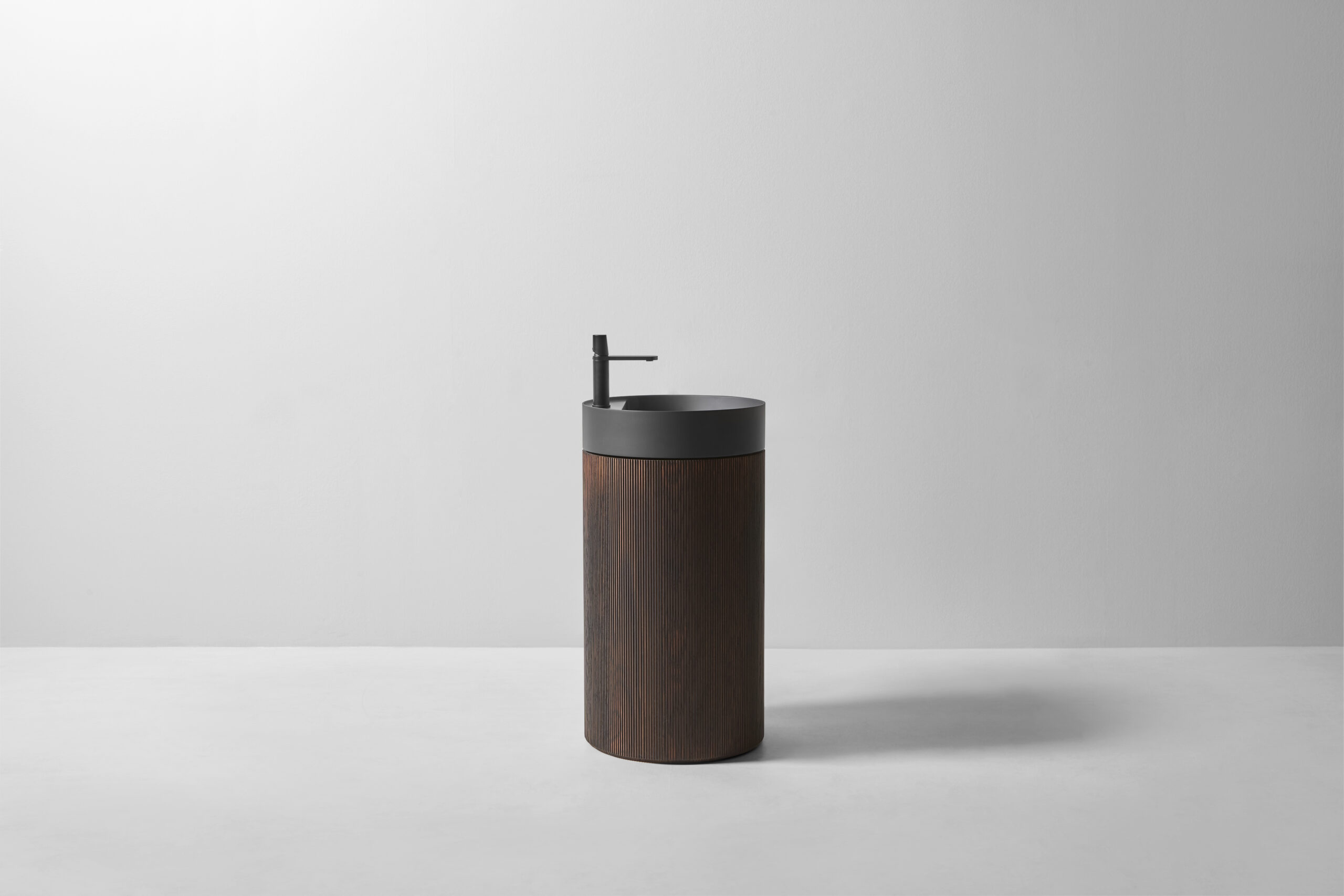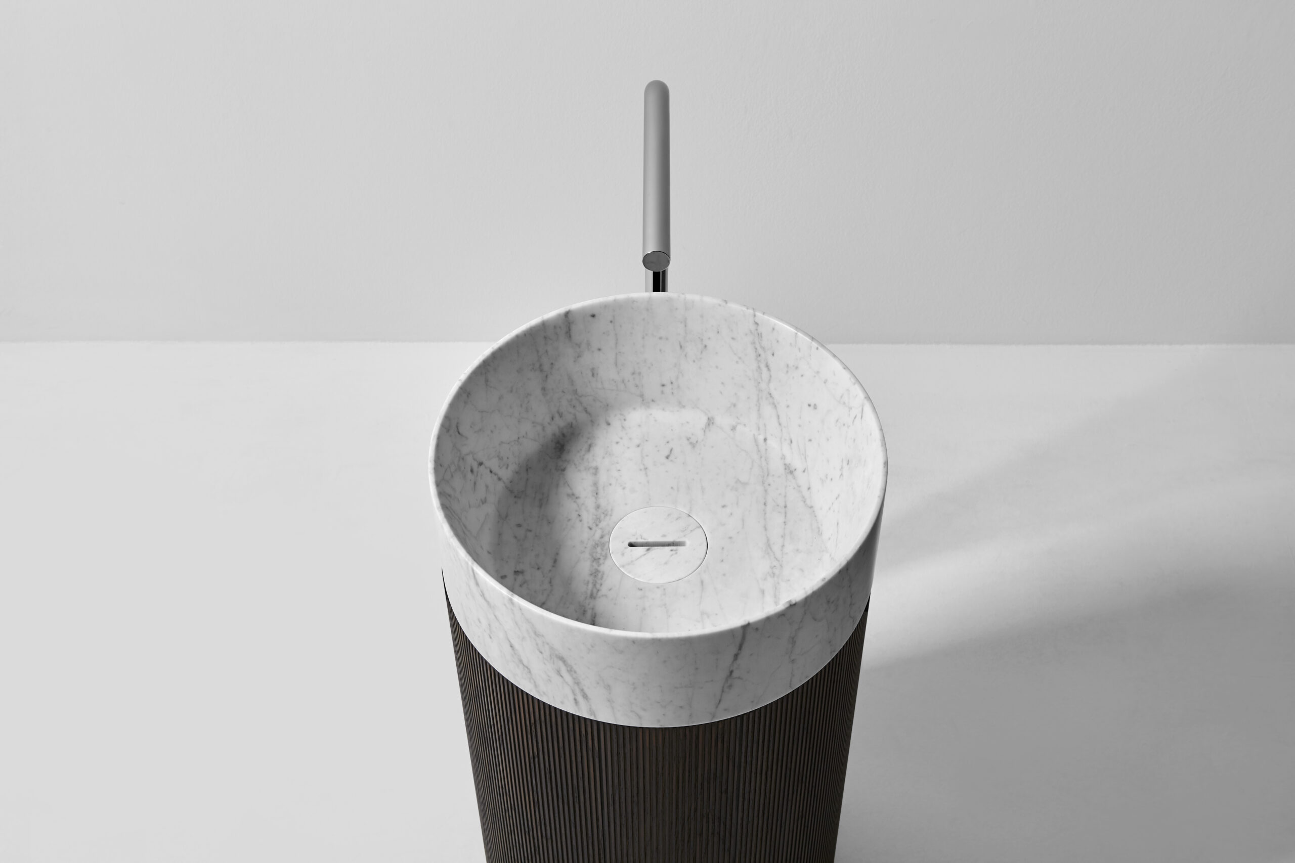 Il bacino, collocato sulla sommità, amplia ulteriormente le possibilità: oltre alla versione in marmo, può essere realizzato in Flumood e Colormood, materiali antoniolupi dalla finitura opaca e uniforme, capaci di esaltare la purezza delle forme. Un contrasto studiato con la colonna, che in questo dialogo tra superfici lisce e superfici materiche trova la sua cifra più contemporanea.