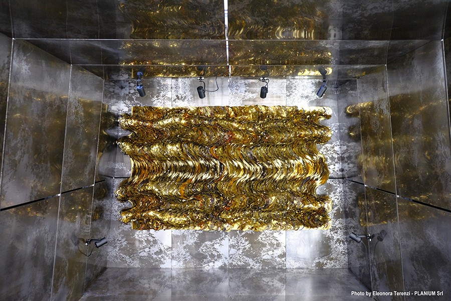Wave11, costituita di quasi 200 lamine di ottone e rame ossidati finemente lavorate, ha rappresentato di questo percorso il senso figurativo “finale” rimandando al tema del dOT con un’onda metallica piena delle sue alghe marine.
