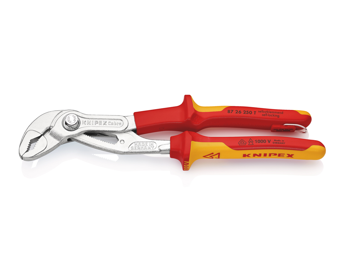 Pinza regolabile di nuova generazione per tubi e dadi, isolata isolante con manici rivestiti in materiali multicomponenti, collaudati VDE; con anello di fissaggio isolante incorporato per agganciare una protezione anticaduta cromata 250 mm (confezione self-service/blister)