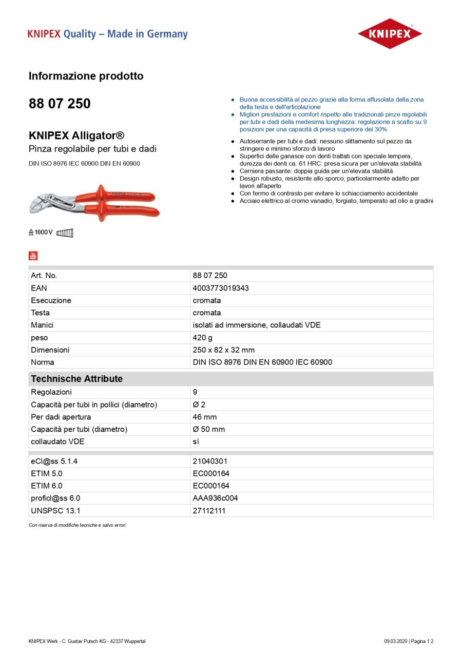 Pinza regolabile per tubi e dadi isolati ad immersione, collaudati VDE cromata 250 mm