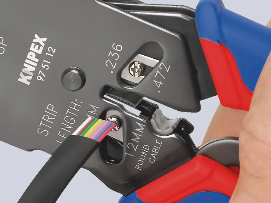 – Con tronchese e lama spelacavi per cavo piatto con lunghezze di 6 e 12 mm