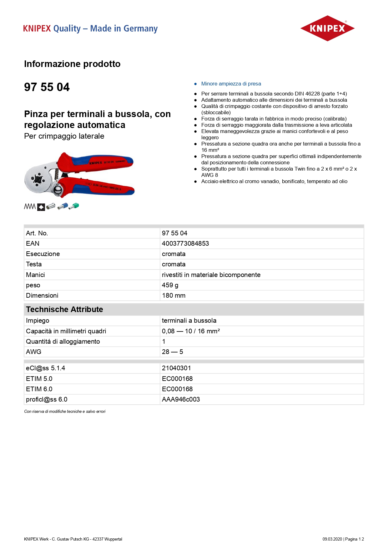 Pinza per terminali a bussola, con regolazione automatica per crimpaggio laterale rivestiti in materiale bicomponente cromata 180 mm