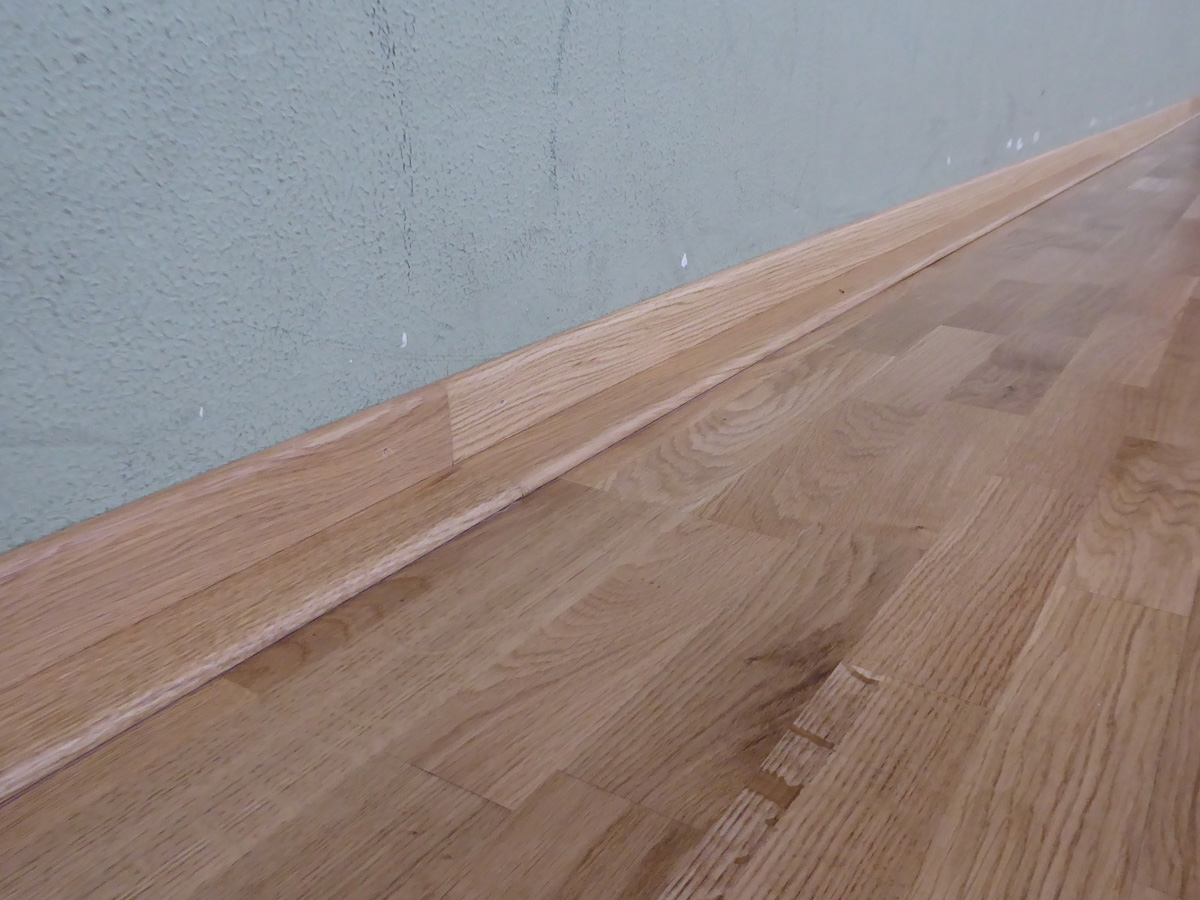 Il battiscopa di forma angolare di 60 x 60 mm in legno verniciato ha la funzione di coprire lo spazio di dilatazione che viene lasciato fra pavimento e muro. Viene posto in opera con viti e tasselli a passo di chiodatura 60 cm. È possibile realizzare un battiscopa fessurato in modo tale da consentire la ventilazione e la traspirazione della sottostruttura, particolarmente indicato per pavimenti con riscaldamento radiante.
