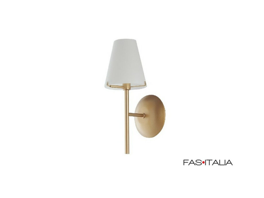 Lampada da parete in metallo, colore oro, con diffusore in vetro bianco.