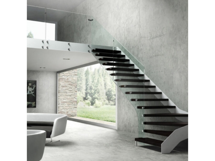 Scala a giorno composta da struttura al muro a I in acciaio verniciato e gradini a sbalzo in faggio colore a scelta. Ringhiera in cristalli avvitata al gradino con rotoulle in acciaio inox.