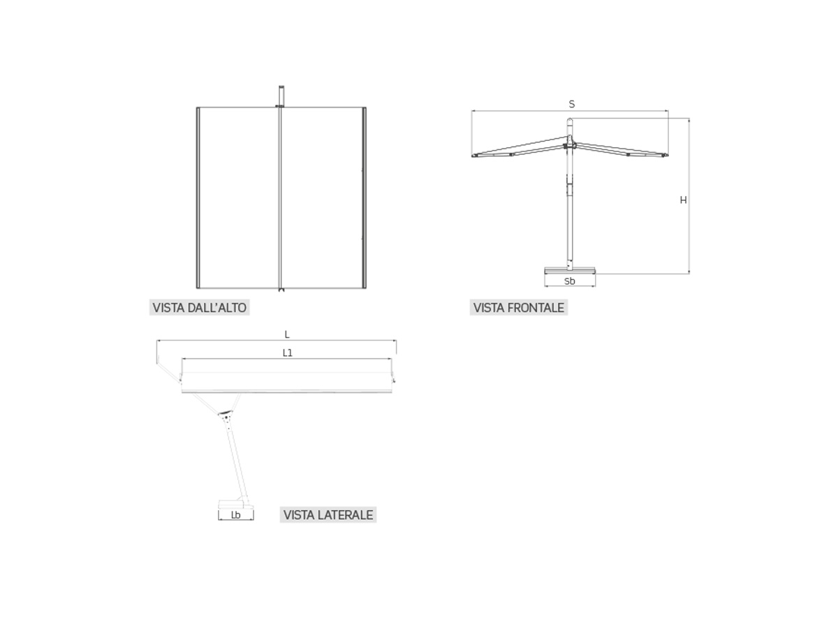 Sistema ombreggiante a palo singolo e dotato di trave orizzontale, dalla quale si diramano due tende da sole. Ciascuna tenda รจ montata su doppio braccio, che si estende lateralmente fino a produrre una grande superficie unica ombreggiante.