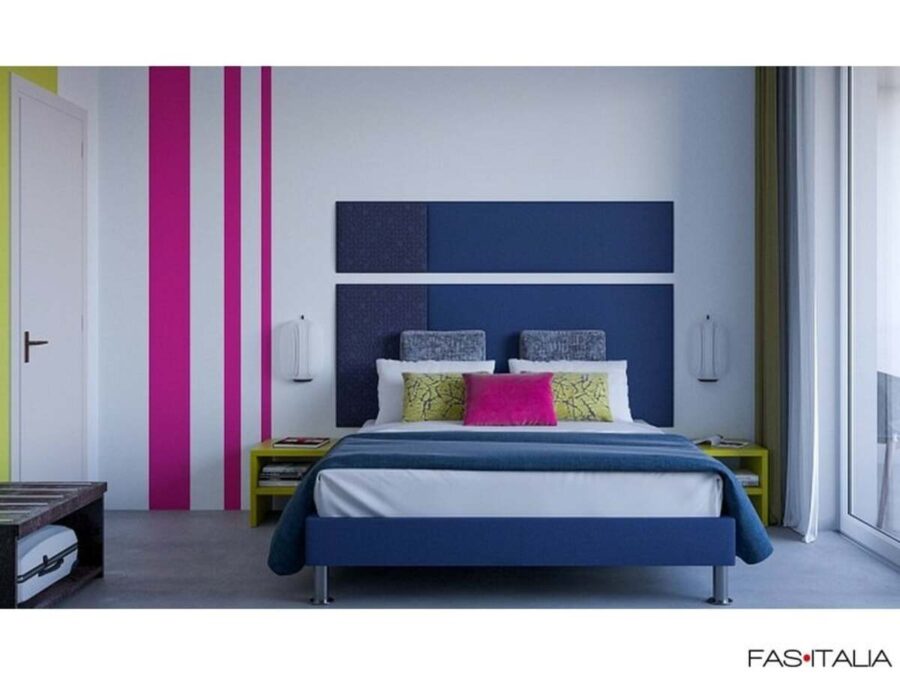 Soluzione di arredamento per camera di albergo posizionata in un contesto urbano, caratterizzata da colori accesi e toni moderni. L’uso sapiente dei colori e degli accostamenti cromatici, dei materiali e delle texture creano un ambiente dinamico, d’impatto e moderno.