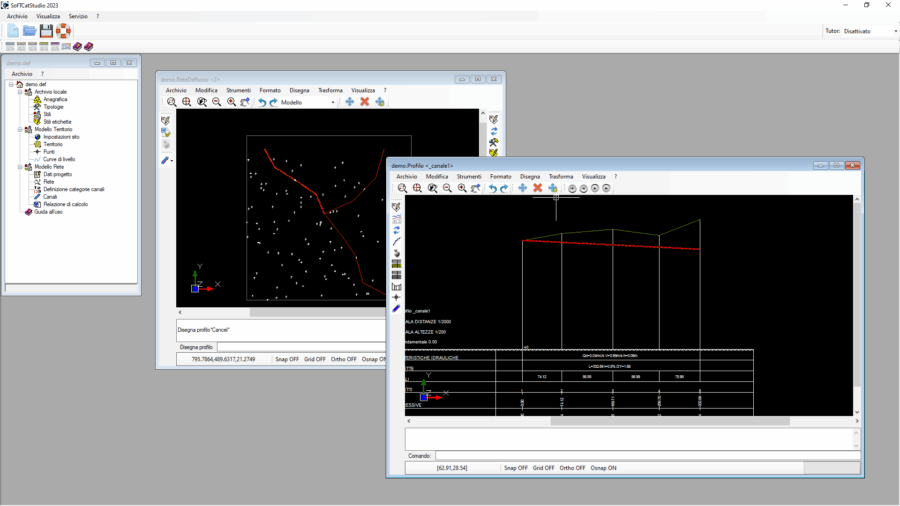 Canali permette di gestire una intera rete di deflusso, immessa in modo totalmente grafico, con l’ausilio del CAD interno che consente di importare anche sfondi in formato dxf/dwg. Le formule di resistenza utilizzate per il calcolo sono quelle di Gauckler-Strickler, Manning-Strickler, Chezy-Bazin e Chezy-Kutter.