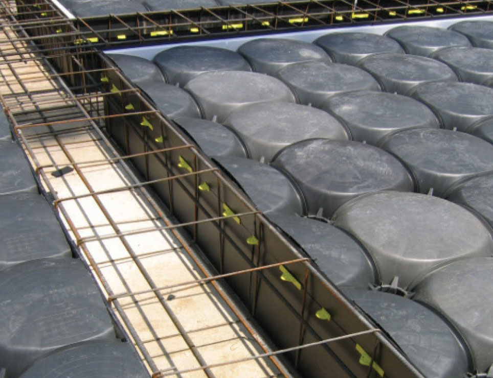 Detta cassaforma a perdere è costituita dalla combinazione di tubi, pannelli, collari e staffe tutto realizzato in polipropilene.