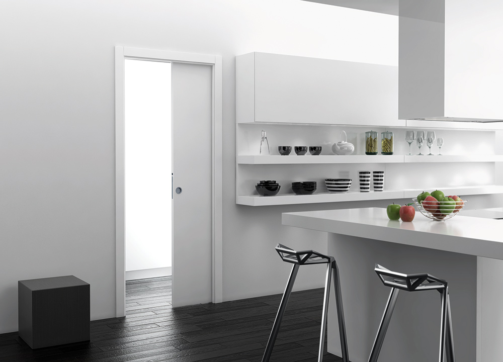 Una porta a scomparsa si apre senza occupare spazio, lasciando libera la parete e senza alcun ingombro in apertura. Una soluzione funzionale che svincola il progetto e lascia spazio alla fantasia.