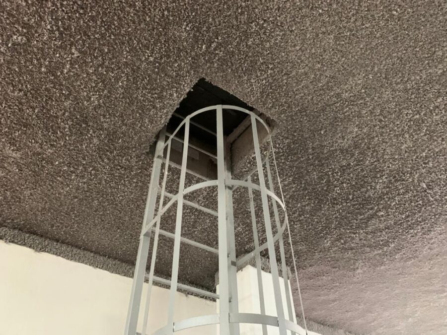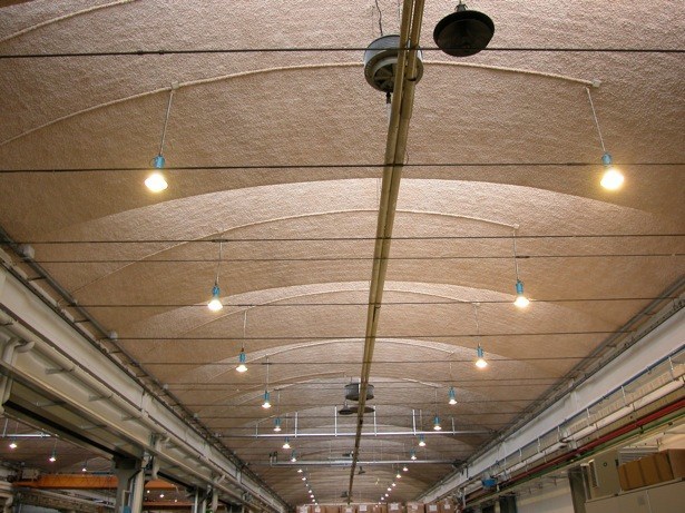 climacell akust è posato mediante sistema a spruzzo al soffitto con aggiunta di acqua e colla ecologica (utilizzata anche per la produzione di tovaglioli di carta) con uno spessore di 1 – 3 cm a secondo della prestazione fonoassorbente richiesta.