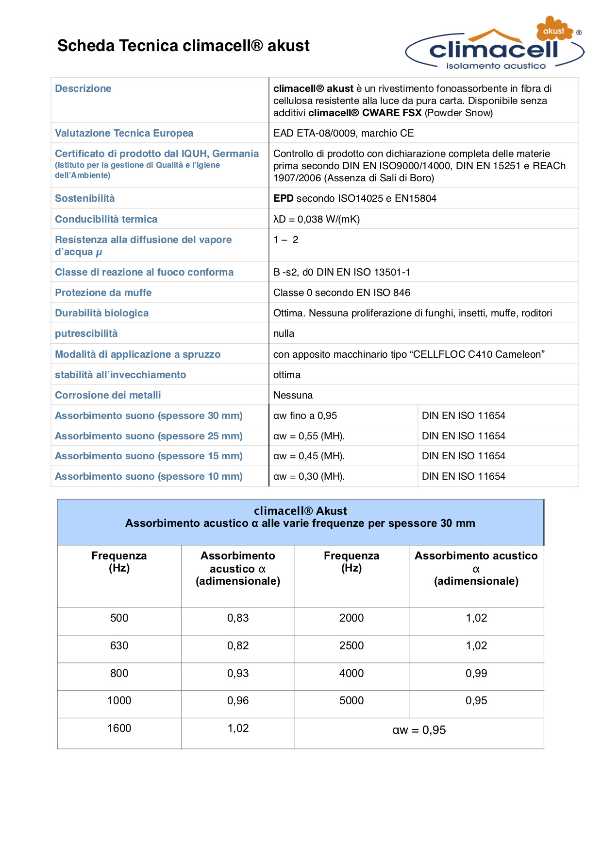 Climacell® è disponibile anche nella versione “akust”, con elevate prestazioni di assorbimento acustico a tutte le frequenze, particolarmente indicata per interventi di correzione o bonifica acustica degli ambienti, al fine di ottenere il tempo ottimale di riverbero in funzione della destinazione d’uso.