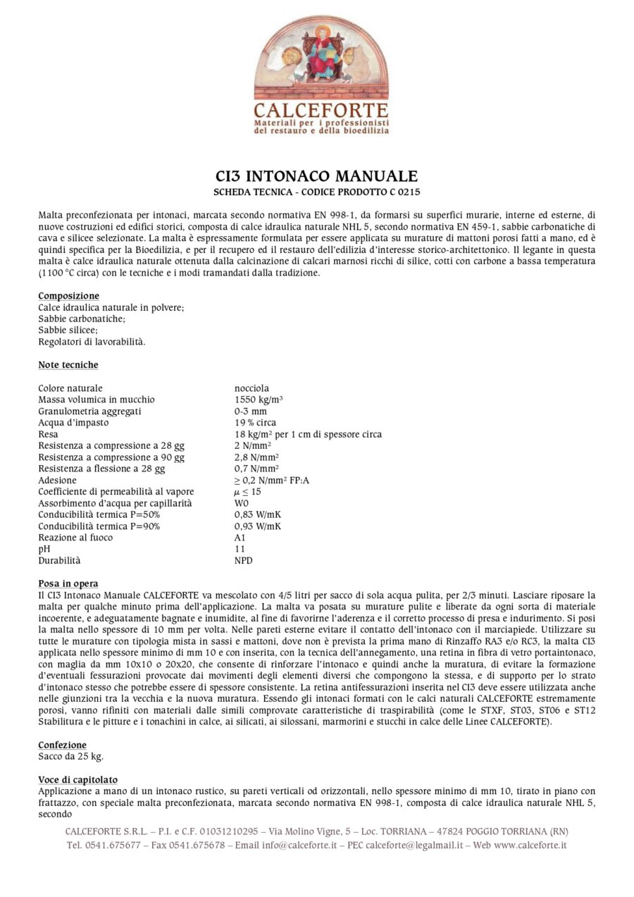 CM3 INTONACO MECCANICO è una malta preconfezionata per intonaci, da formarsi su superfici murarie, interne ed esterne, di nuove costruzioni e edifici storici, composta di calce idraulica naturale NHL5, secondo normativa EN 459-1, sabbie carbonatiche di cava selezionate. CM3 Intonaco Meccanico è espressamente formulato per essere applicato su murature di mattoni porosi fatti a mano, ed è quindi un prodotto specifico per il recupero ed il restauro dell’edilizia d’interesse storico-architettonico. Il legante utilizzato nella composizione chimica di questa malta è calce idraulica naturale ottenuta dalla calcinazione di calcari marnosi ricchi di silice, cotti con carbone a bassa temperatura (1100 °C circa) con le tecniche e i modi tramandati dalla tradizione. CM3 INTONACO MECCANICO è una malta specificatamente formulata per essere proiettata con spruzzatrici meccaniche.