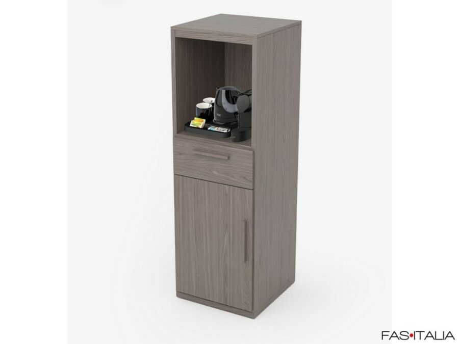 Colonna attrezzata per contenere tutto ciò che serve per un servizio colazione in camera. Il vano inferiore con anta battente racchiude un minibar (non incluso), che può essere uno dei nostri modelli 11427, 11425, 11504. Il cassetto serve per riporre capsule, bustine e snack, mentre nel vano a giorno si possono posizionare un bollitore ed una macchinetta del caffĆØ, in modo da avere tutto ciò che compete alla colazione in camera sempre a portata di mano in un’unica colonna. Mobile utilizzabile anche in sala convegni come stazione di coffee break o come postazione di benvenuto in reception. Disponibile in un’ampia gamma di finiture diverse. Dimensioni: 46,5×47,0x134 cm (LxPxH). Dimensioni vano frigo: 42×44,8×57 cm (LxPxH). Dimensioni vano a giorno: 42×42,5×45 cm (LxPxH)