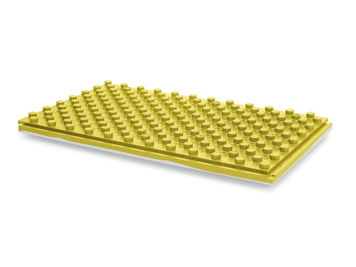 Sistema basato sul pannello COMPACT BASIC, pannello di tipo a nocche. Può essere associato ad ogni tipo di tubo di diametro 16 o 17 mm e, sebbene con grande deformazione della nocca, anche tubo di diametro 20 mm; il tubo viene trattenuto in posizione dal pannello stesso, con interasse di posa multiplo di 5 cm. Lo strato di supporto può essere in sabbia e cemento, purché additivato con FLUTERM® e di spessore minimo sopra tubo 40/45 mm, oppure a base solfato di calcio, spessore minimo sopra tubo 30/35 mm (come da DIN 18560-2 per massetti con classe di resistenza a flessione F4, cioè ≥4 N/mm2, posati su strati isolanti di spessore minore/maggiore di 40 mm, per carichi utili verticali ≤2 kN/m2). Necessario prevedere il giunto di dilatazione perimetrale e gli opportuni giunti di dilatazione strutturali.
