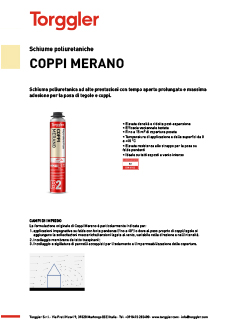 Coppi Merano è una schiuma poliuretanica monocomponente confezionata in bombola aerosol. Premendo l’erogatore esce una massa schiumosa che, reagendo con l’umidità dell’aria indurisce progressivamente, aumentando leggermente in volume e perdendo la sua iniziale appiccicosità . Si ottiene così una schiuma semirigida e impermeabile, di colore marroncino, che aderisce tenacemente a legno, calcestruzzo, laterizio, fibrocemento, metallo, vetro, superfici bituminose invecchiate e svariate plastiche con l’eccezione di polietilene, teflon e silicone. La sua formulazione chimica, collaudata in 20 anni di storia e di cantieri, presenta una molteplicità di vantaggi sul prodotto in opera, sia che venga applicato a punti che su file con interruzioni regolari: