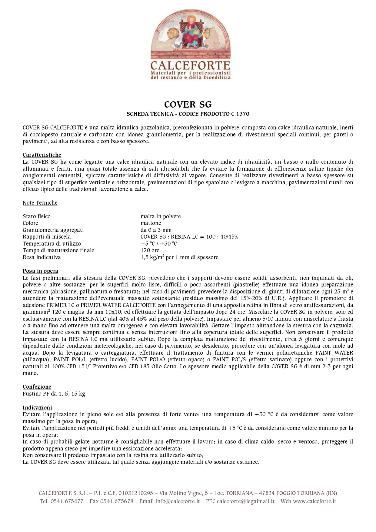 COVER SG CALCEFORTE è una malta per rivestimenti continui, di natura idraulica pozzolanica. E’ un materiale preconfezionato in polvere, composta con calce idraulica naturale NHL 5, inerti di cocciopesto naturale e carbonato con idonea granulometria (0-3 mm). Indicazioni d’uso: realizzazione di rivestimenti speciali continui, pareti o pavimenti, ad alta resistenza e con basso spessore.