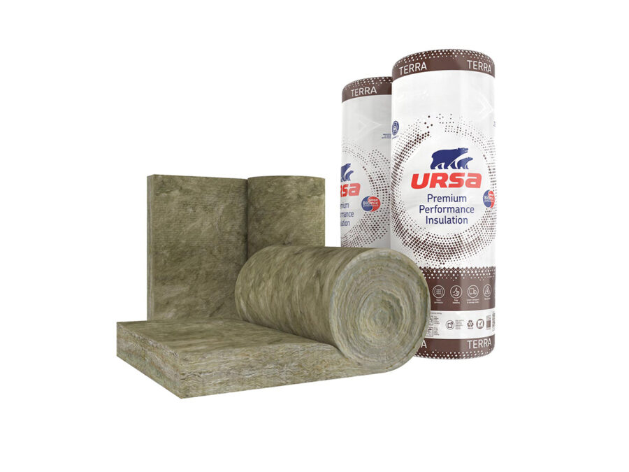 Feltro arrotolato idrorepellente in lana di vetro trattata con speciali resine termoindurenti marcato CE in conformità alla norma EN 13162, rivestito su una superficie con carta kraft, con funzione di freno al vapore, realizzato con tecnologia di produzione URSA BiOnic Performance.