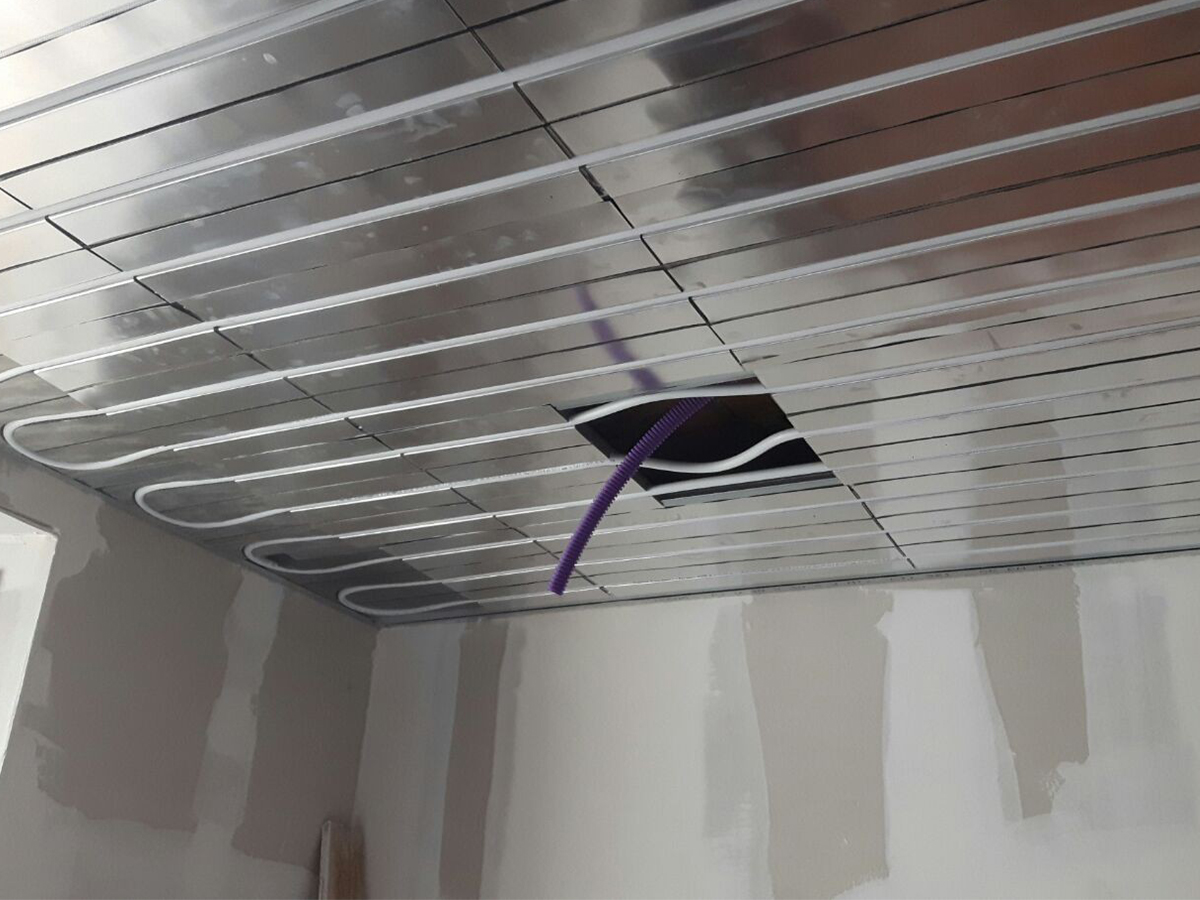 Sistema radiante a soffitto realizzato con i pannelli a secco DRY 40 in lastre da 40×60 cm in polistirene estruso additivato di grafite accoppiato con lamelle sagomate in alluminio puro per il contenimento del tubo scambiatore di calore.