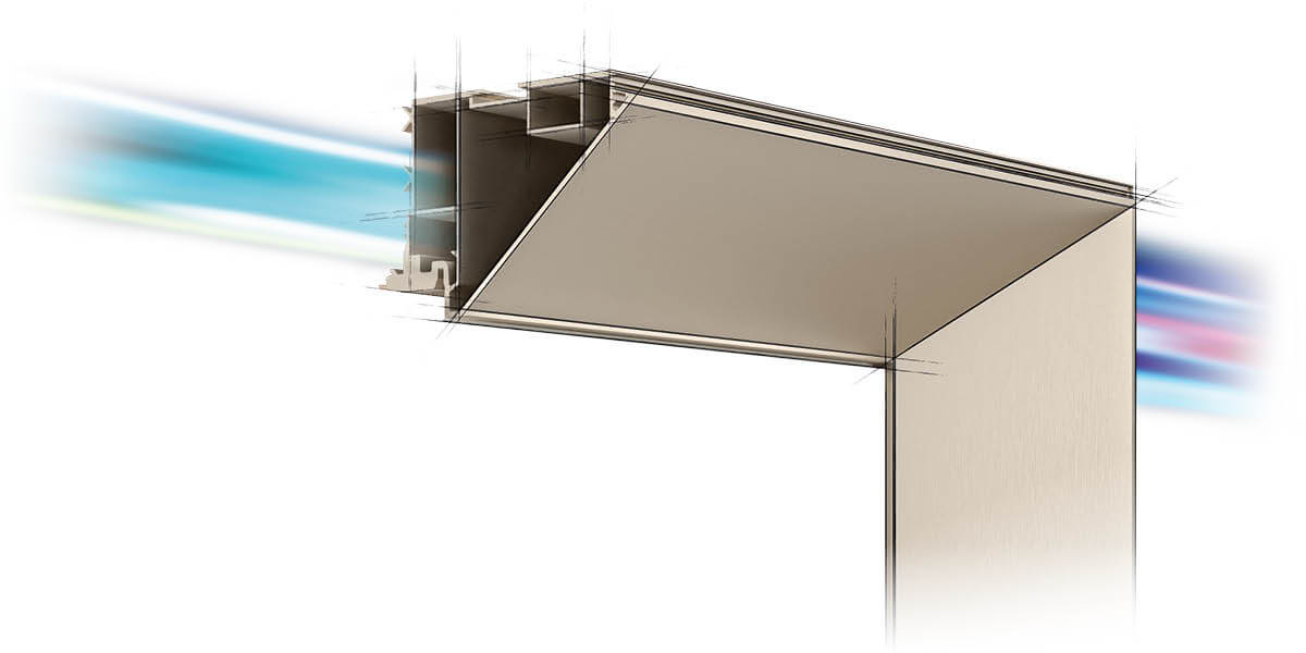 Da un lato, i profili in alluminio del telaio definiscono una strombatura netta, che crea un senso di profondità rispetto alla parete definito dalle superfici inclinate a 40 gradi.‎ La struttura svuota la superficie e diventa un elemento decorativo che incornicia la porta.‎ Dall’altro lato, lo stesso telaio offre una porta filomuro elegante e discreta.