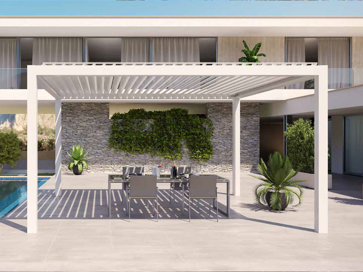 Elba è una pergola a lamelle orientabili fino a 140°, progettata e strutturata per soddisfare pienamente l’esigenza di protezione dal sole anche in spazi esterni dalle dimensioni ridotte.