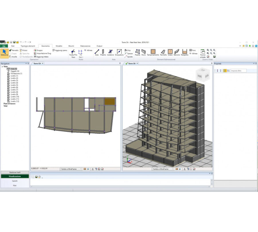 Tutti i comandi di input di FaTA Next sono disponibili sia in ambiente bidimensionale (utile alla gestione delle classiche strutture organizzate ad impalcati) che in ambito tridimensionale. Oltre alla geometria è possibile gestire aspetti propri della modellazione strutturale come: vincoli esterni per i vari oggetti, molle, carichi concentrati e coppie, rilasci dei gradi di libertà interni (ad es. cerniere interne), carichi ripartiti (nel riferimento globale o locale) sui vari oggetti.