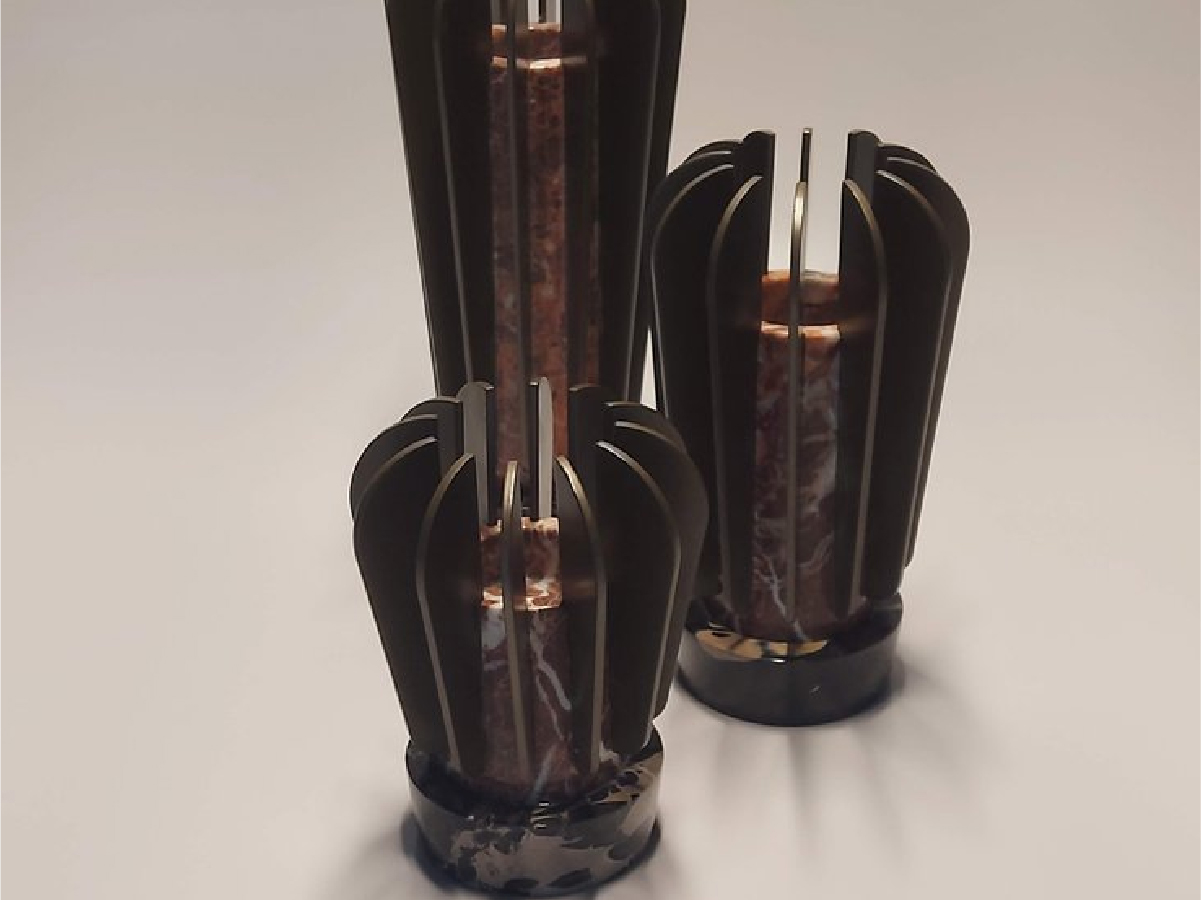Crafted from polished marble pieces and polished bronze fins, the SPARTA Candle Holder boasts a unique design inspired by Spartan clothing.