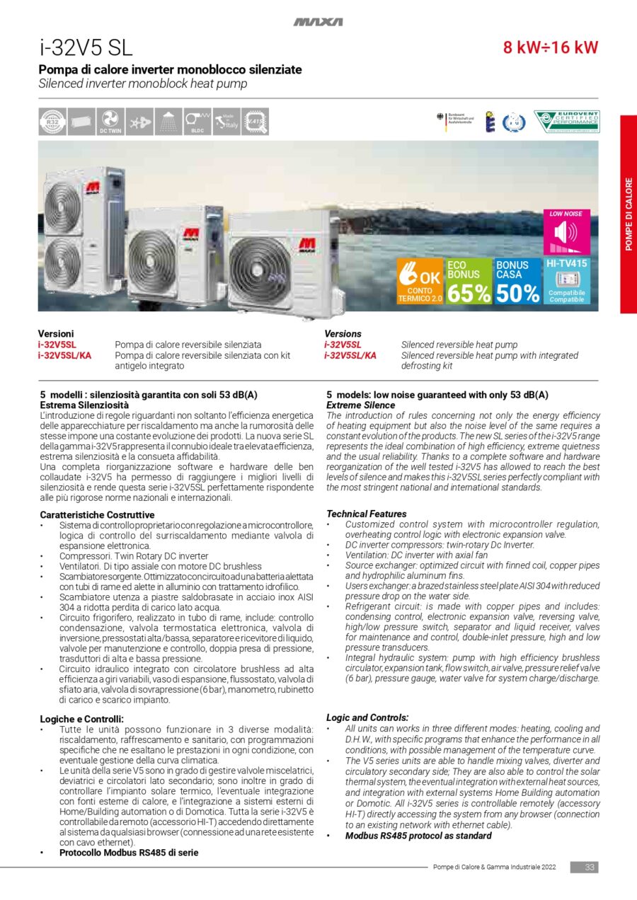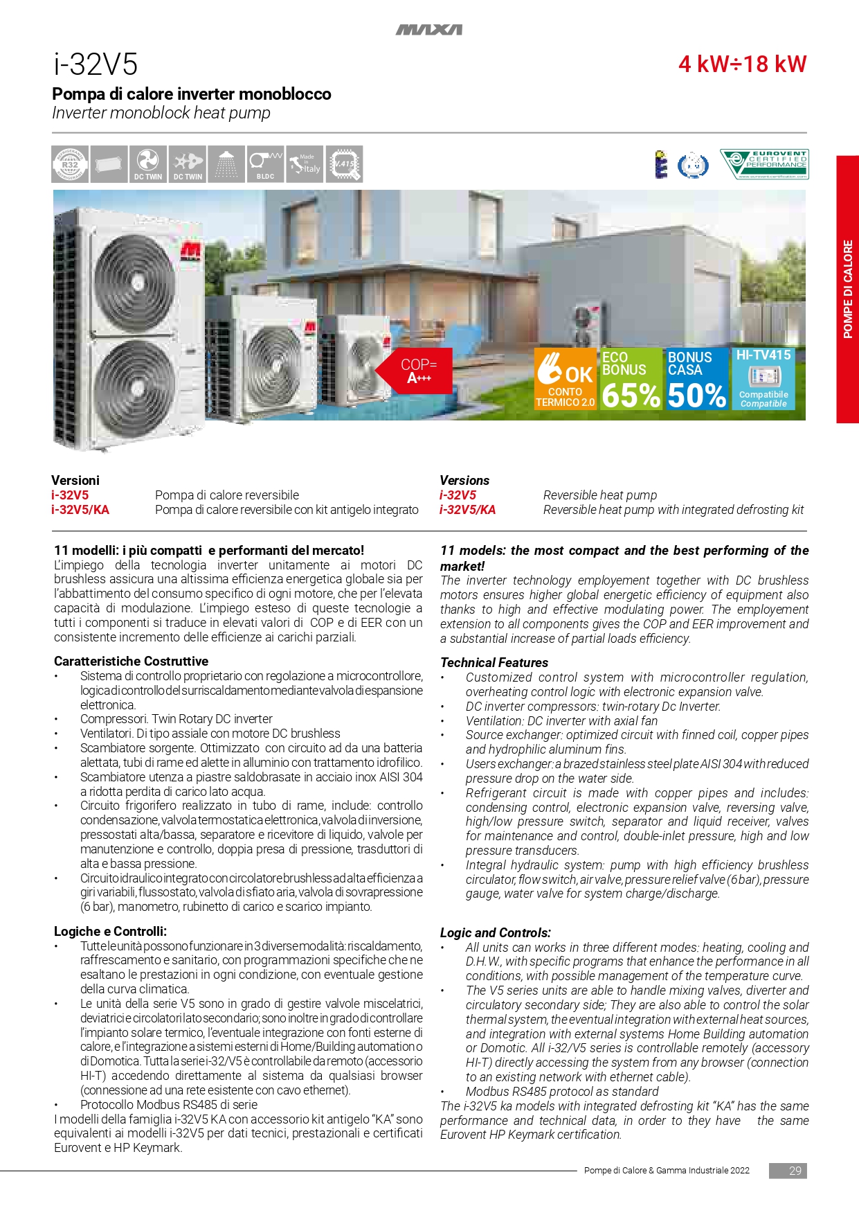 Pompe di calore aria/acqua con compressori DC inverter con gas R32, ventilatori DC brushless e kit idronico con circolatore a taglio di fase