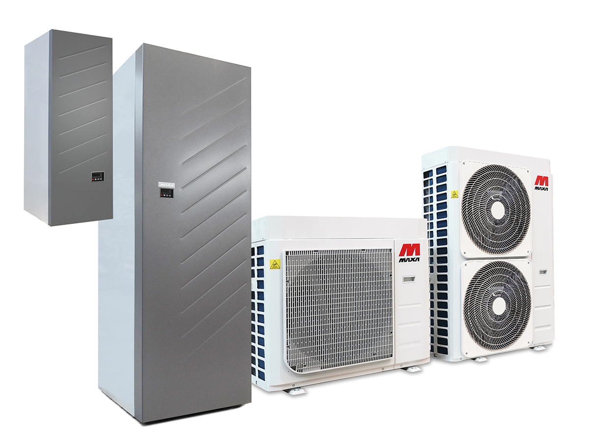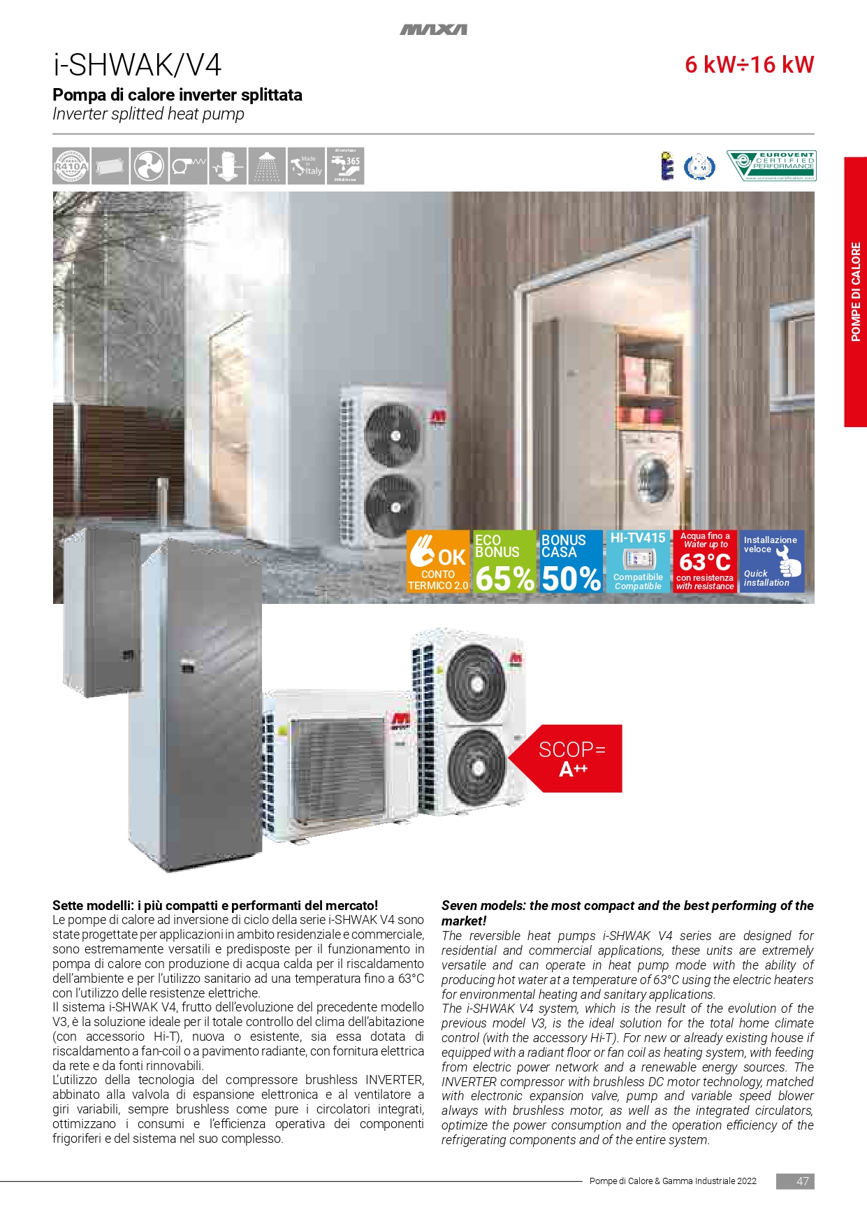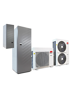 Pompe di calore splittate con unità interne pensile o armadio, aria/acqua con unità interna/esterna con tecnologia DC Inverter, pompa modulante, kit idronico, ventilatori Dc Brushless e controllo condensazione.