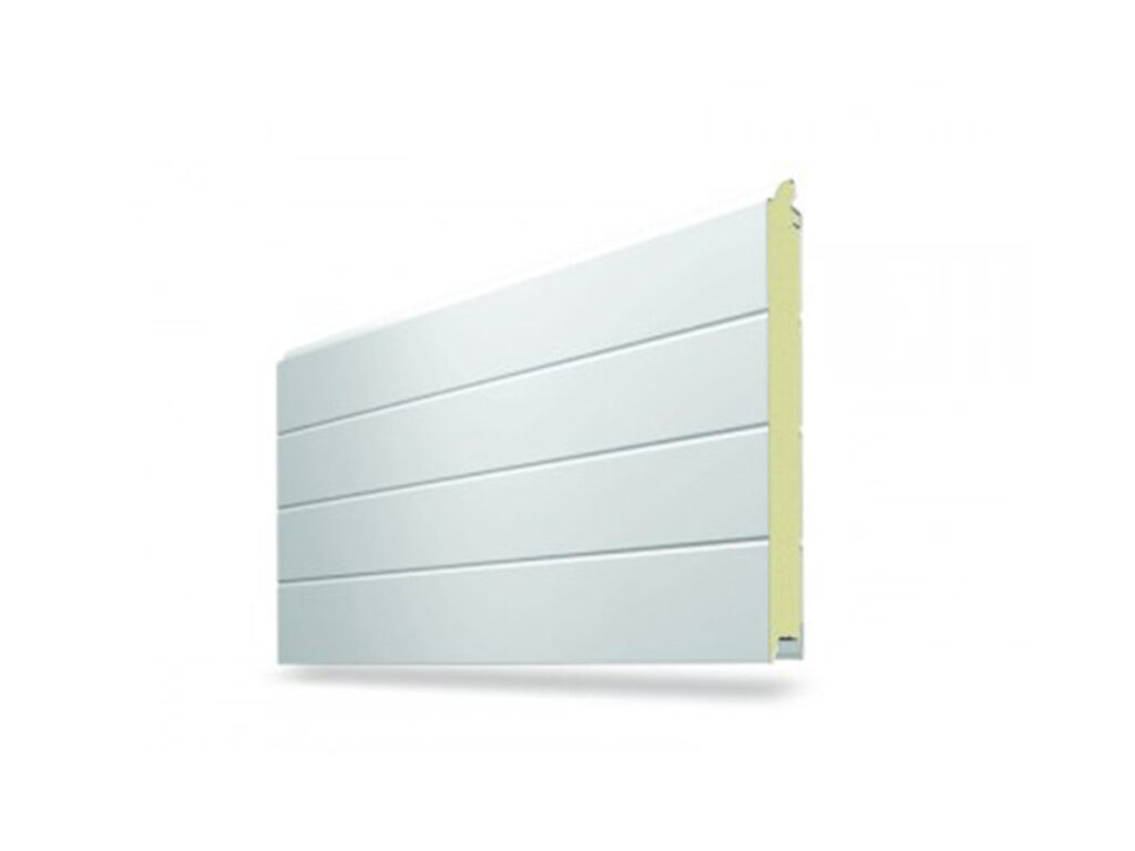 Pannello sandwich con isolante in schiuma poliuretanica destinato all’utilizzo nel settore dei portoni sezionali ad uso civile. Il pannello, costituito da due supporti metallici, ha una geometria del giunto tale da evitare lo schiacciamento in fase di chiusura delle porte.