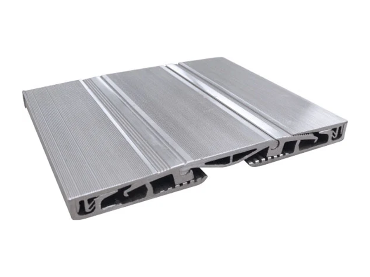 Sistema di giunzione per giunti strutturali a pavimento fino a 220 mm di ampiezza, soggetti ad elevati movimenti fino a +/-30 mm, in ambienti commerciali ed industriali soggetti a traffico pesante di muletti e transpallets. Il sistema è realizzato completamente in alluminio senza fissaggi in vista ed offre ai veicoli una superficie di passaggio liscia, per transito senza scosse. Sezione rettangolare senza alette laterali sottopavimentazione. Il sistema compensa anche cedimenti verticali.