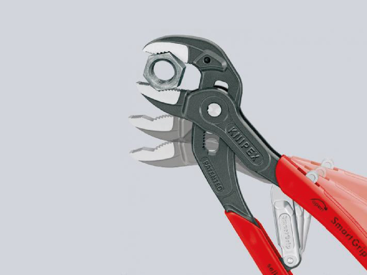 Posizionare la pinza sul pezzo e chiudere la pinza. E’ tutto. Con una pressione della mano, la pinza Knipex 85 01 250 SmartGrip si regola automaticamente sulle dimensioni del pezzo e si blocca autonomamente su di esso senza slittamenti. Questo è ideale soprattutto quando si devono afferrare rapidamente in serie pezzi di diverse dimensioni, perchè permette di eliminare molte manovre. Sommando i secondi risparmiati con questo metodo, a lungo andare si ottiene un certo guadagno in termini di tempo di lavoro: per mancini e destrimano.