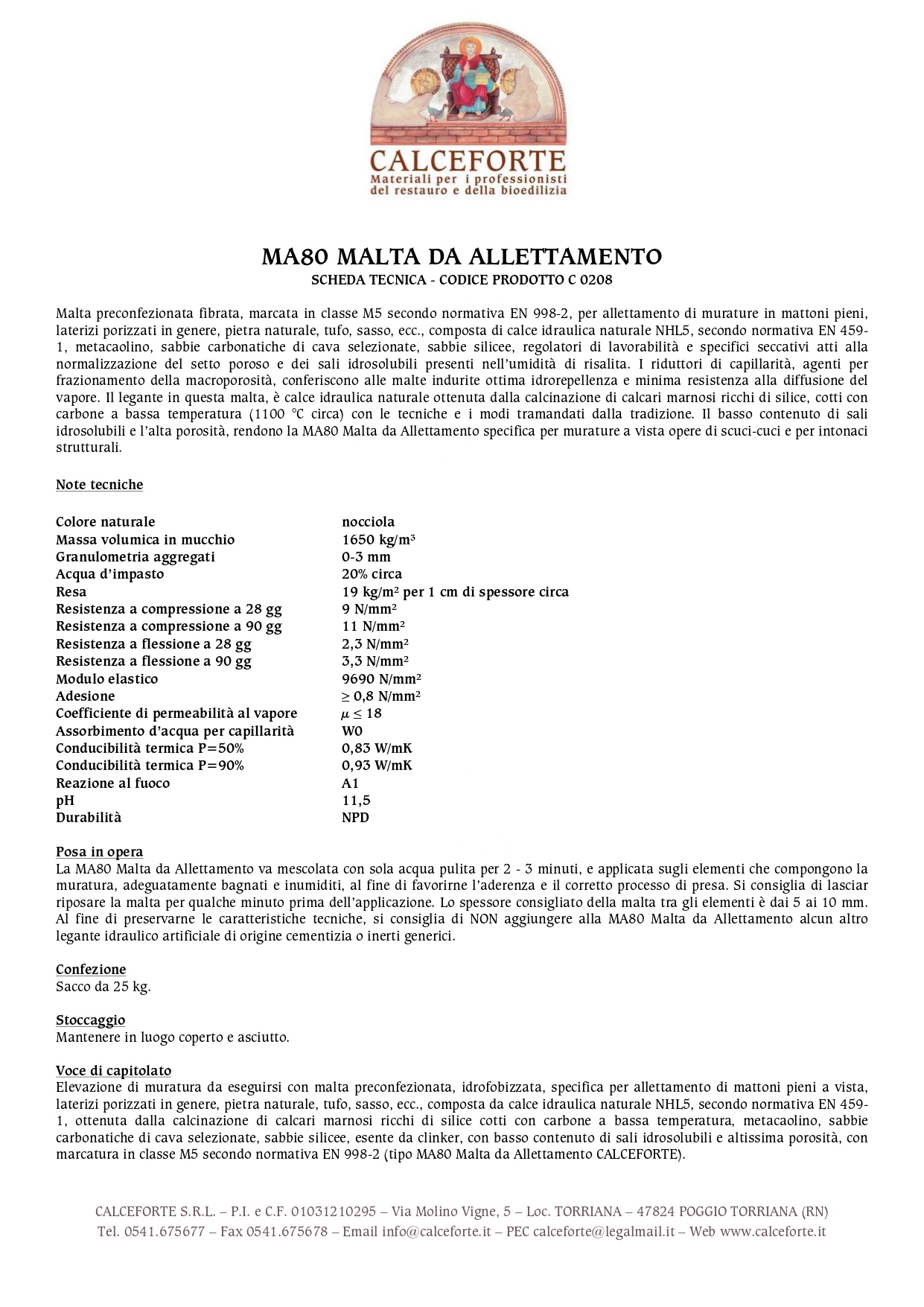 Elevazione di muratura da eseguirsi con malta preconfezionata, idrofobizzata, specifica per allettamento di mattoni pieni a vista, laterizi porizzati in genere, pietra naturale, tufo, sasso. Prodotto in calce idraulica naturale NHL5 ottenuta dalla calcinazione di calcari marnosi ricchi di silice cotti con carbone a bassa temperatura, metacaolino, sabbie carbonatiche di cava selezionate, sabbie silicee, esente da clinker. Basso contenuto di sali idrosolubili e altissima porosità. Prodotto a marcatura in classe M5 secondo normativa EN 998-2 (tipo MA80 MALTA DA ALLETTAMENTO CALCEFORTE).