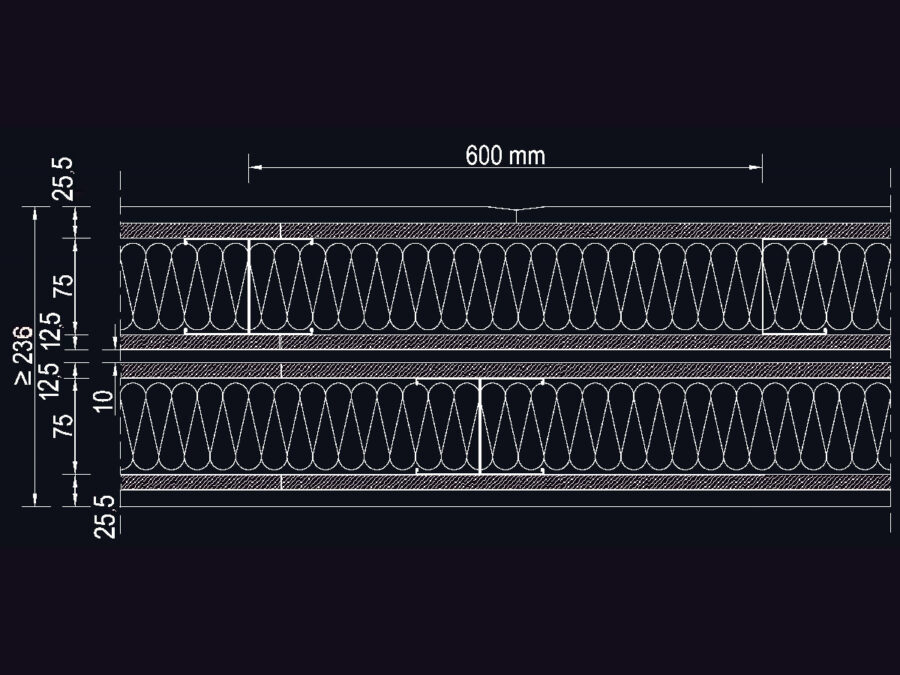 Nell’intercapedine di ogni modulo ĆØ inserito un materassino di lana minerale dello spessore di 70mm con funzione di isolamento acustico.