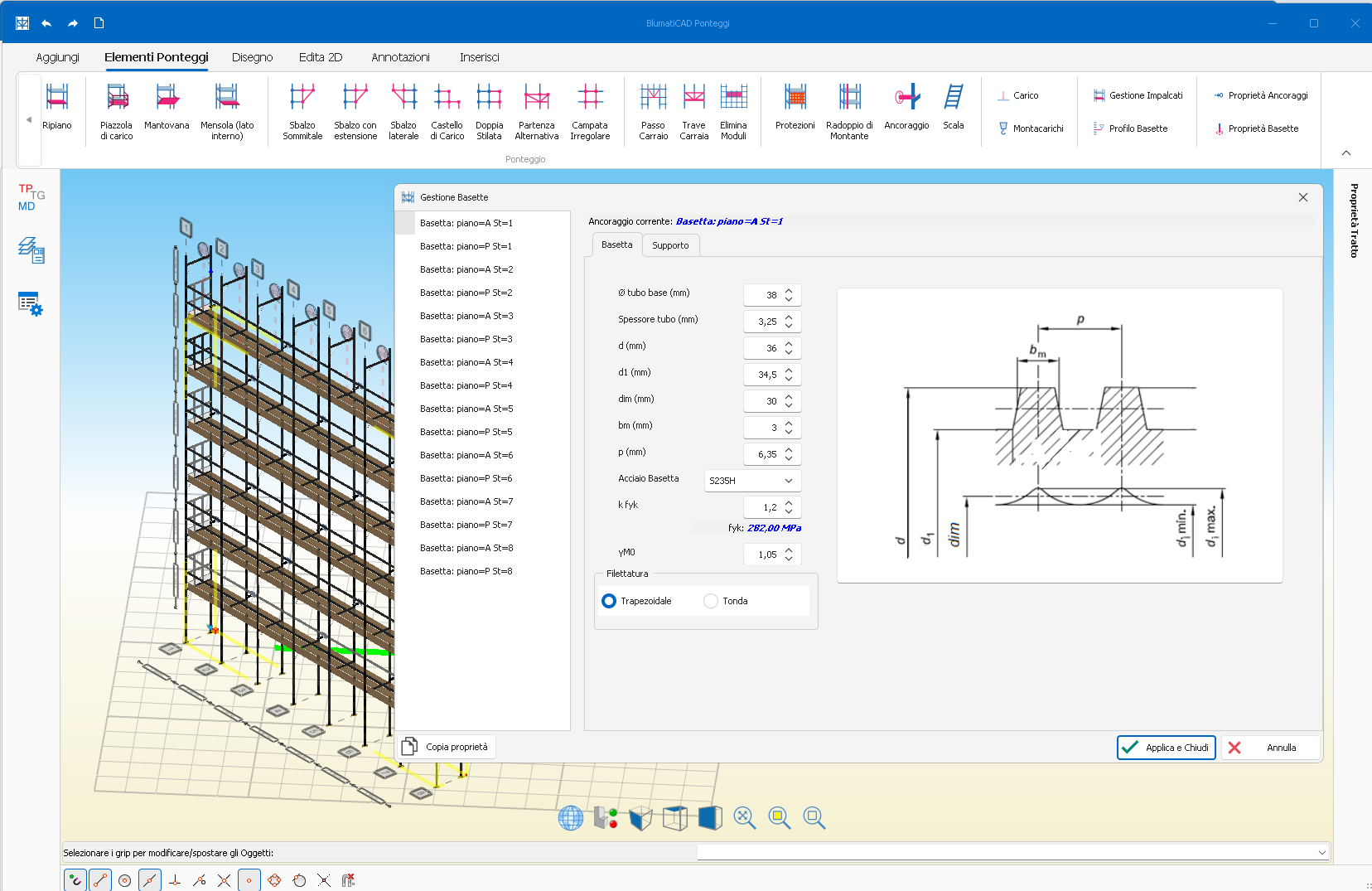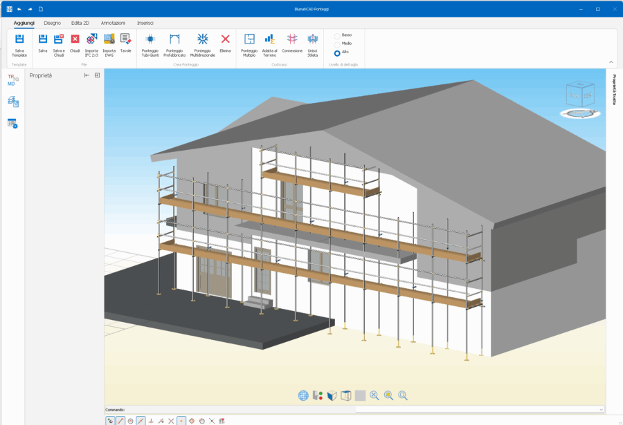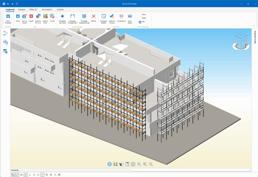 Software per la gestione completa dei ponteggi a telai prefabbricati e/o a tubi e giunti. Modellazione CAD 3D integrata, disegni esecutivi quotati generati dal modello 3D e Pi.M.U.S.