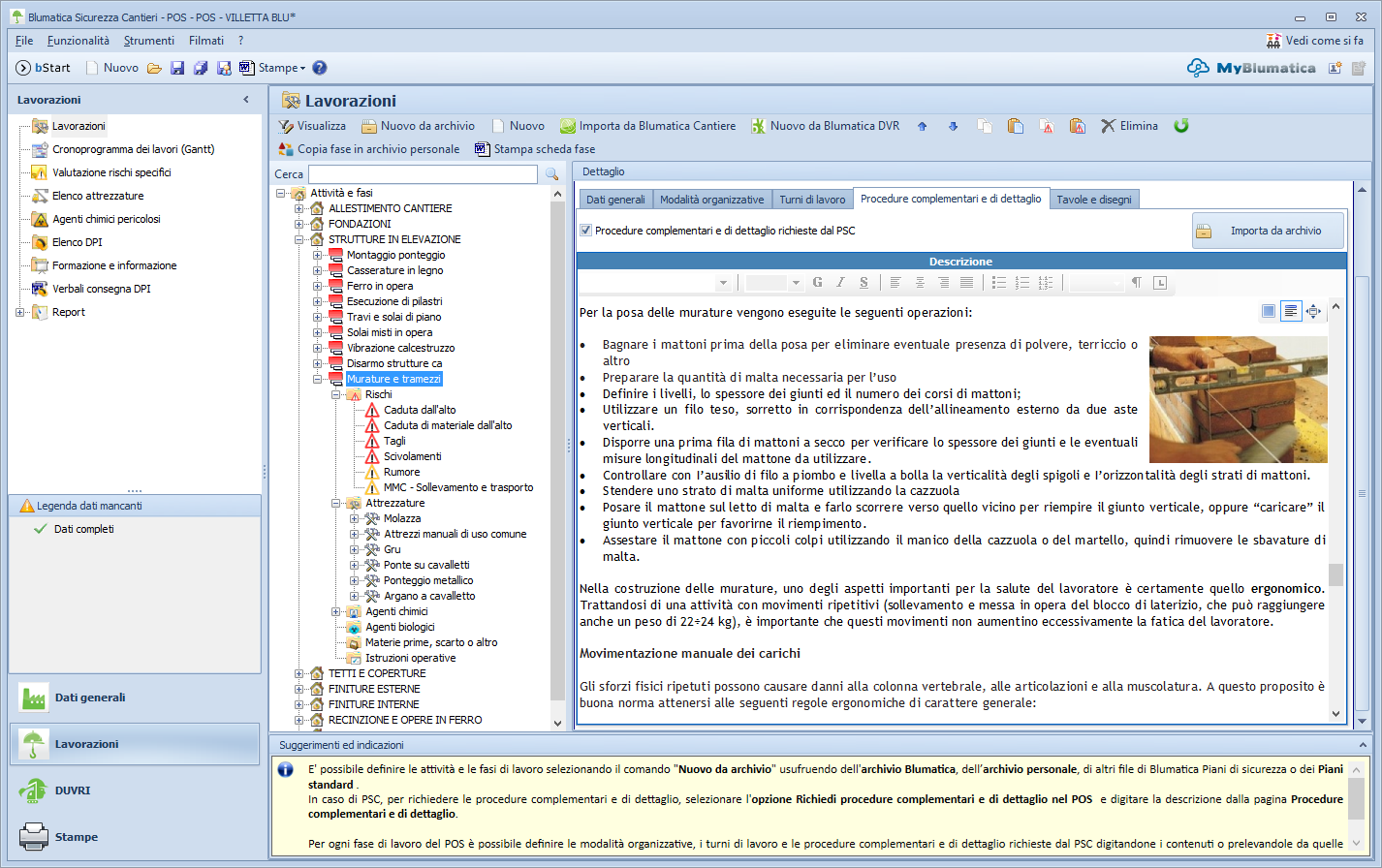 Per ogni tipologia di contenuto è disponibile la banca dati dedicata: organizzazione del cantiere, aree del cantiere, elenco della documentazione, DPI con tutti i riferimenti alle norme UNI, segnaletica e circa 2.000 lavorazioni con valutazione dei rischi precostituita.