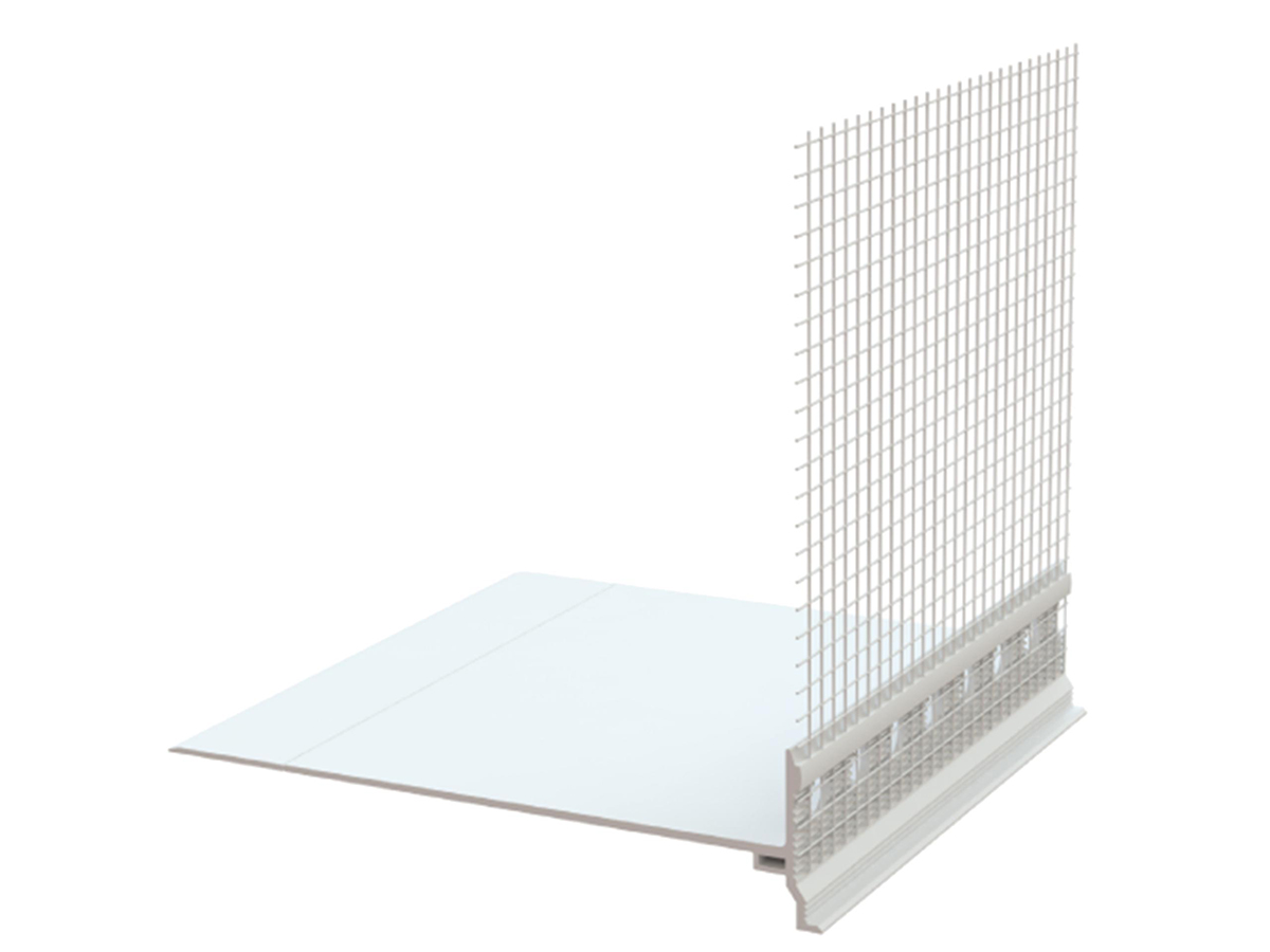 Profilo di inserimento in PVC in combinazione con i profili di partenza L55, L100, L160, chiude ermeticamente e completa la partenza dei sistemi ETICS, con gocciolatoio nascosto.