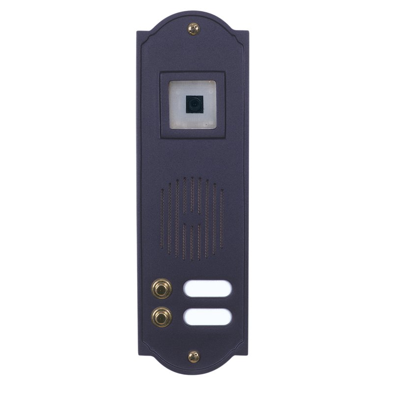 Pulsantiera in ottone a due campanelli con grigia citofonica e predisposizione per alloggiare la videocamera.