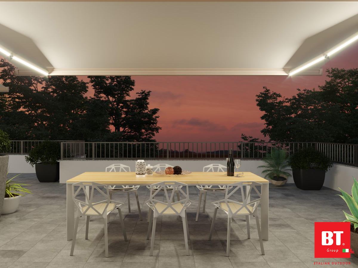 Tenda motorizzata con cassonetto a scomparsa totale per una perfetta protezione del telo e della struttura, dalla forma particolarmente compatta in modo tale da limitare l’ingombro in balconi dalle altezze contenute.