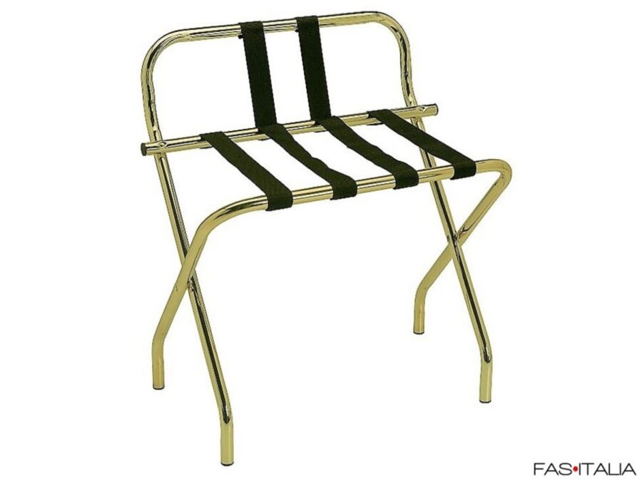 Questo reggivaligia รจ dotato di una struttura pieghevole in tubo di acciaio ottonato al diametro di 2,5 cm e cinghie nere in PVC.