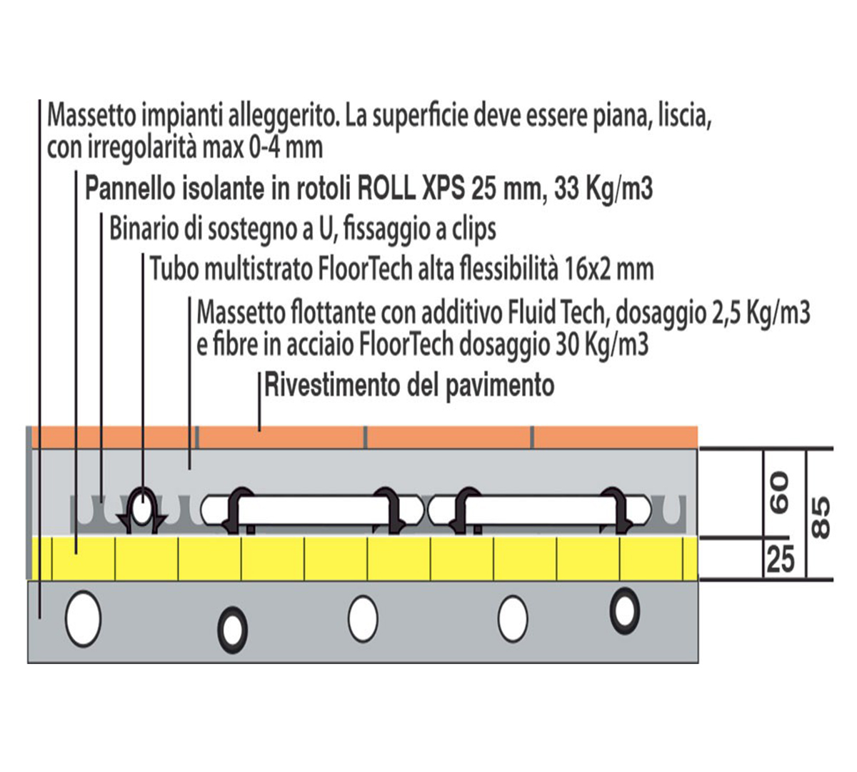 Considerando un massetto di 50 mm (minimo 30 mm sopra il tubo secondo la norma UNI-EN 1264), lo spessore minimo che si può ottenere con un sistema Roll XPS Grafite è di 73 mm (rivestimento escluso).