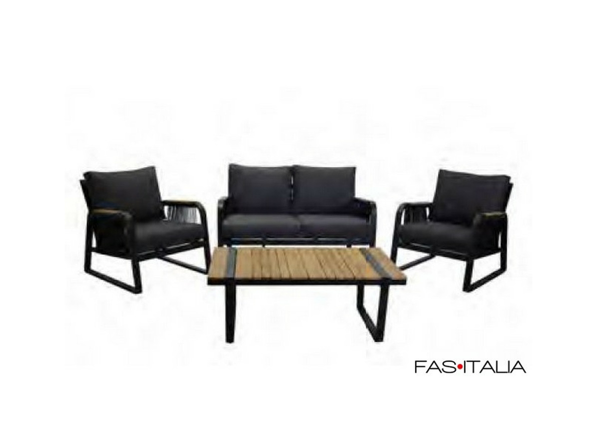 Salotto 4 posti con braccioli curvi. Struttura in alluminio antiruggine con verniciatura a polvere color antracite. Cuscini idrorepellenti sfoderabili color grigio scuro. Top tavolo e braccioli in legno di Teak. Dimensioni poltrona: h 80 x p 71,5 x l 88 cm. Divano: h 79,5 x p 85 x l 133,5 cm. Tavolino: h 46 x p 70 x l 117 cm.