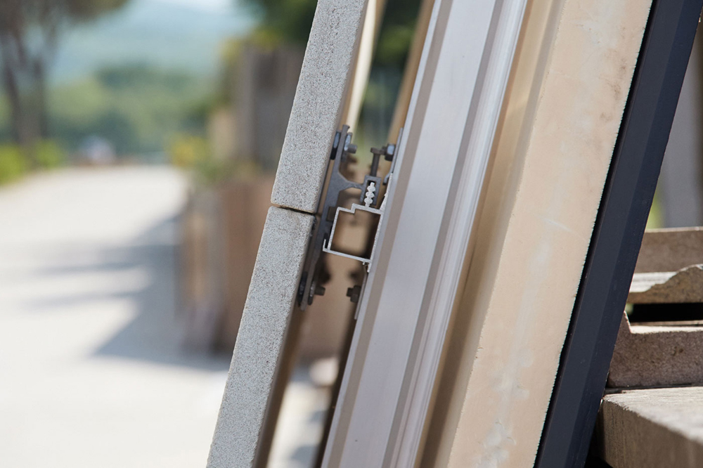Fissaggi con sottostruttura continua leggera: tale sistema di ancoraggio è adatto alla realizzazione di facciate ventilate, con caratteristiche innovative in termini di modularità, flessibilità così come facilità di montaggio e affidabilità in opera.