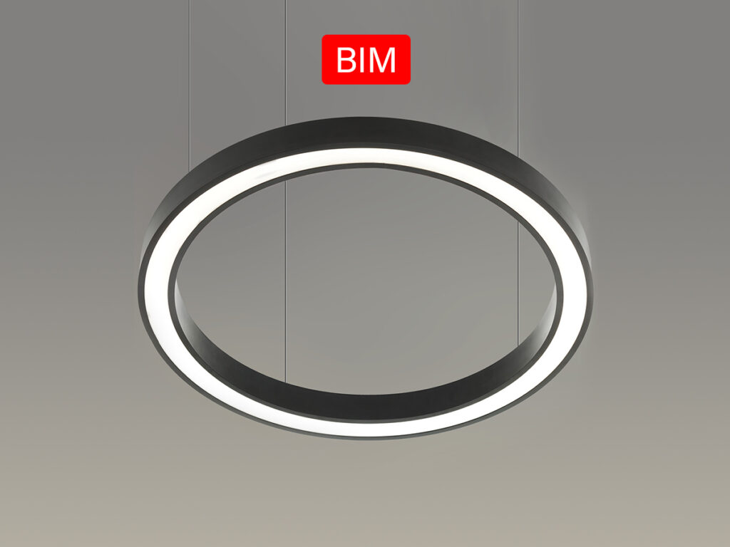 Ring a sospensione in alluminio curvato con diffusore in policarbonato opale ad alta trasmittanza.
