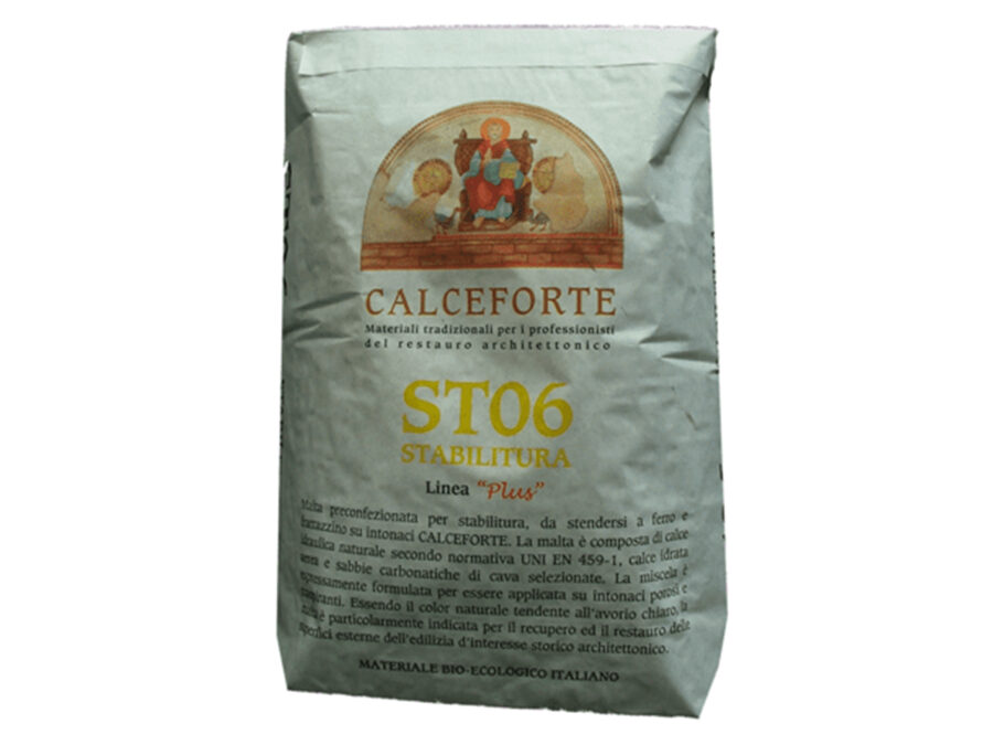 ST06 STABILITURA è una malta per stabiliture da stendersi a ferro e frattazzino su intonaci CALCEFORTE, composta di calce idraulica naturale NHL 5, calce idrata aerea e sabbie carbonatiche di cava selezionate. La miscela è espressamente formulata per essere applicata su intonaci porosi e traspiranti. Essendo il color naturale tendente al neutro petrigno, ST06 è particolarmente indicata per il recupero ed il restauro delle superfici esterne dell’edilizia di interesse storico architettonico. Il legante in questa malta, è calce idraulica naturale ottenuta dalla calcinazione di calcari marnosi ricchi di silice, cotti con carbone a bassa temperatura (1100°C circa), e con le tecniche ed i modi tramandati dalla tradizione.