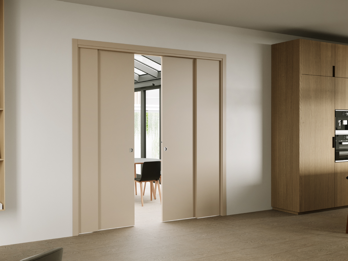 Il sistema scorrevole Staffetta per porte telescopiche è ideale per collegare due grandi spazi, come una sala da pranzo e una cucina; in alternativa, è utile per creare un disimpegno che divida le due aree ma che, a completa apertura, consenta un ampio passaggio, un’ottimale circolazione della luce naturale tra i due ambienti e la massima libertà di movimento.