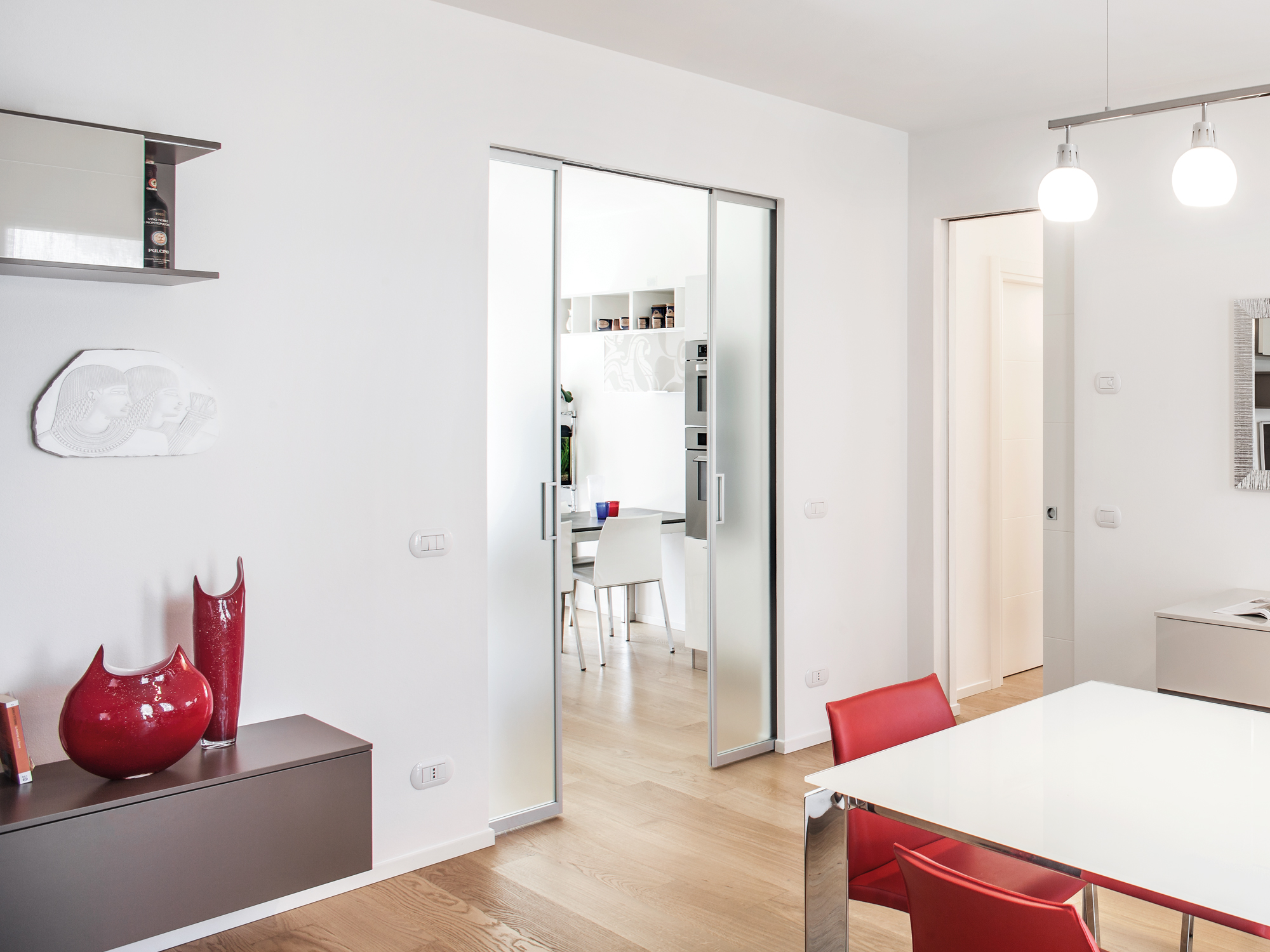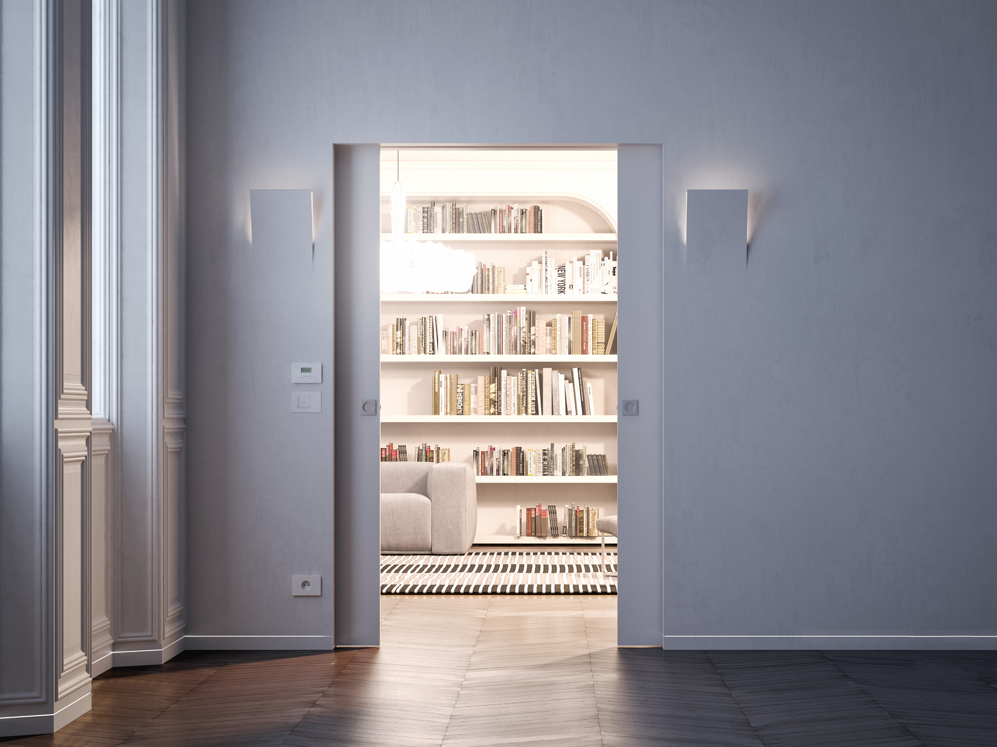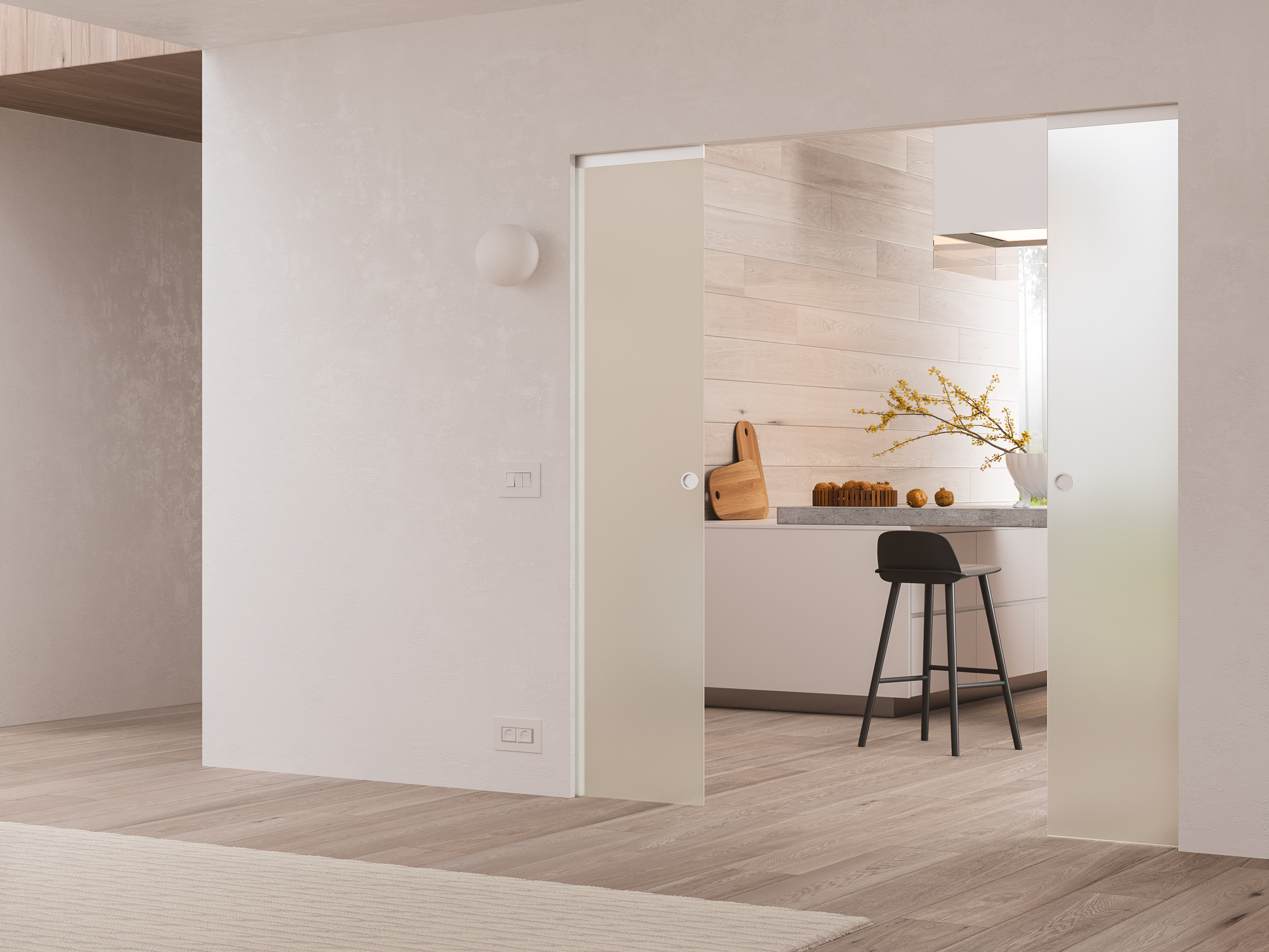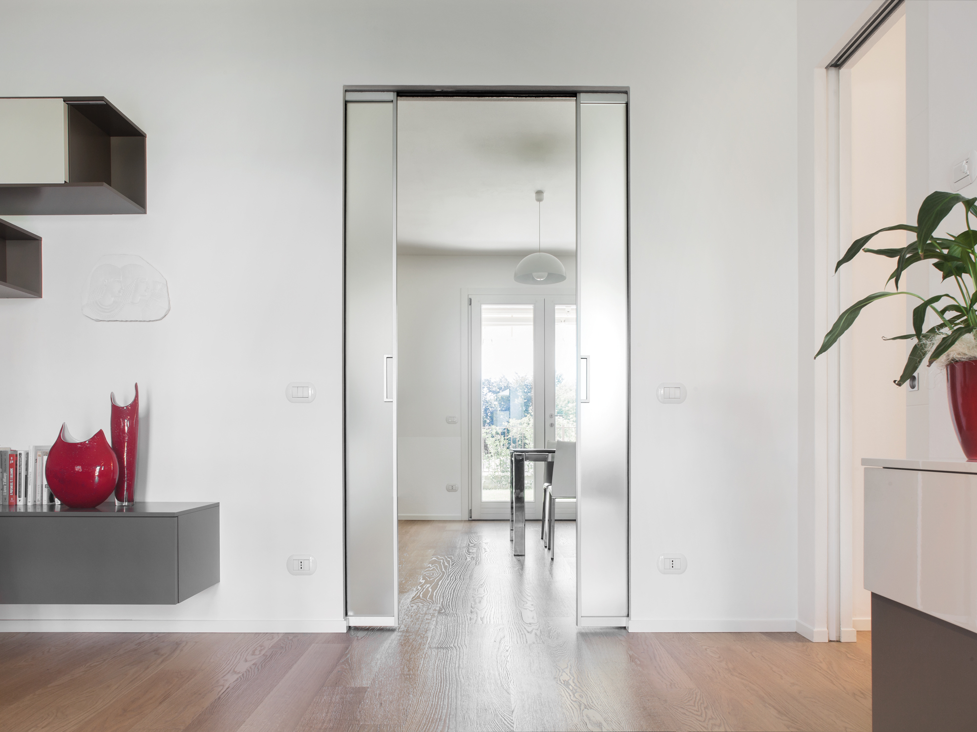L’assenza di stipiti favorisce l’integrazione con la parete: dettagli costruttivi come i profili perimetrali resinati facilitano l’applicazione di intonaco e stucco sul perimetro del foro porta e rendono la struttura completamente invisibile e integrata nel muro.